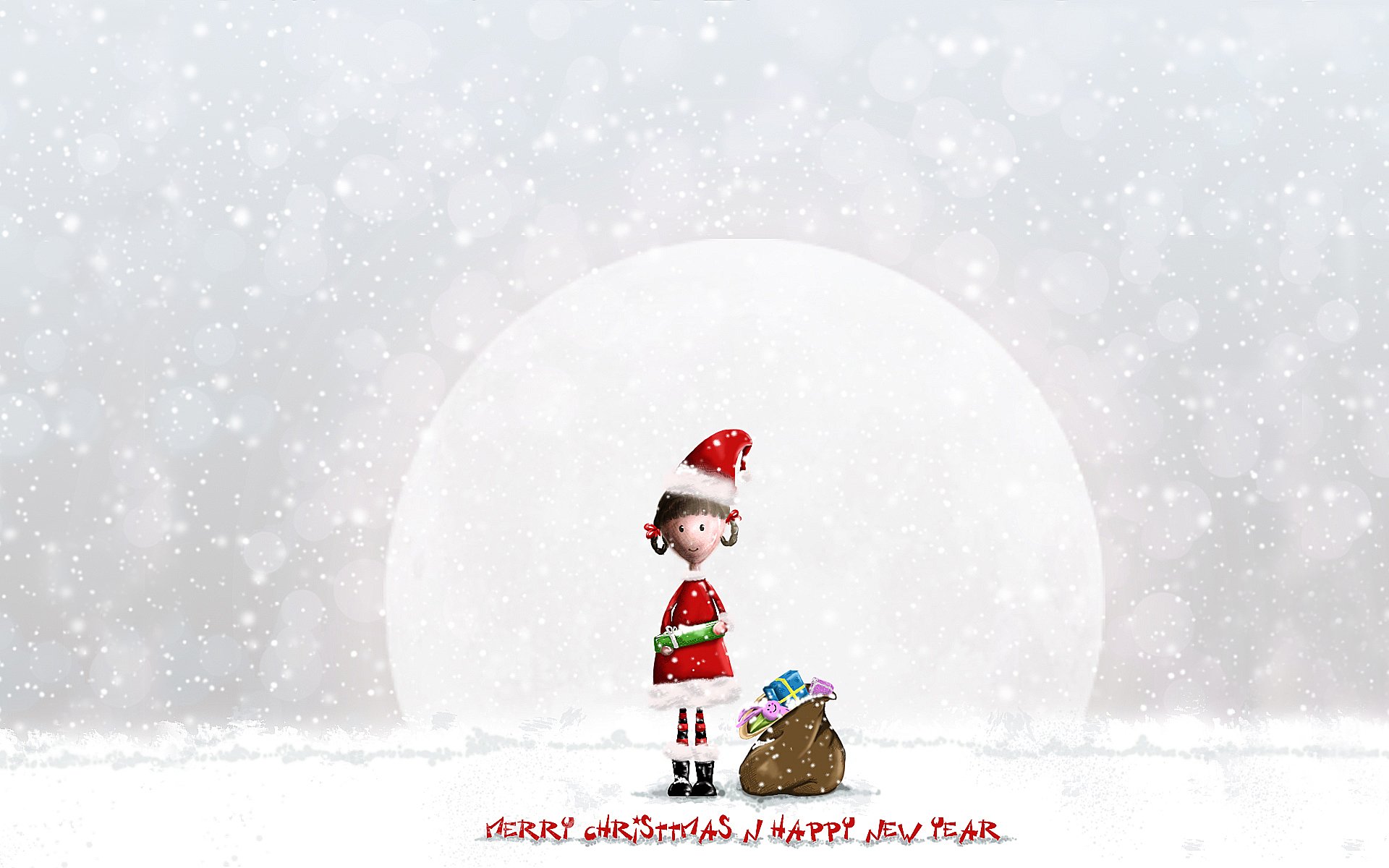 Ragazza in costume di Natale e con il sacchetto dei regali - sfondo del desktop