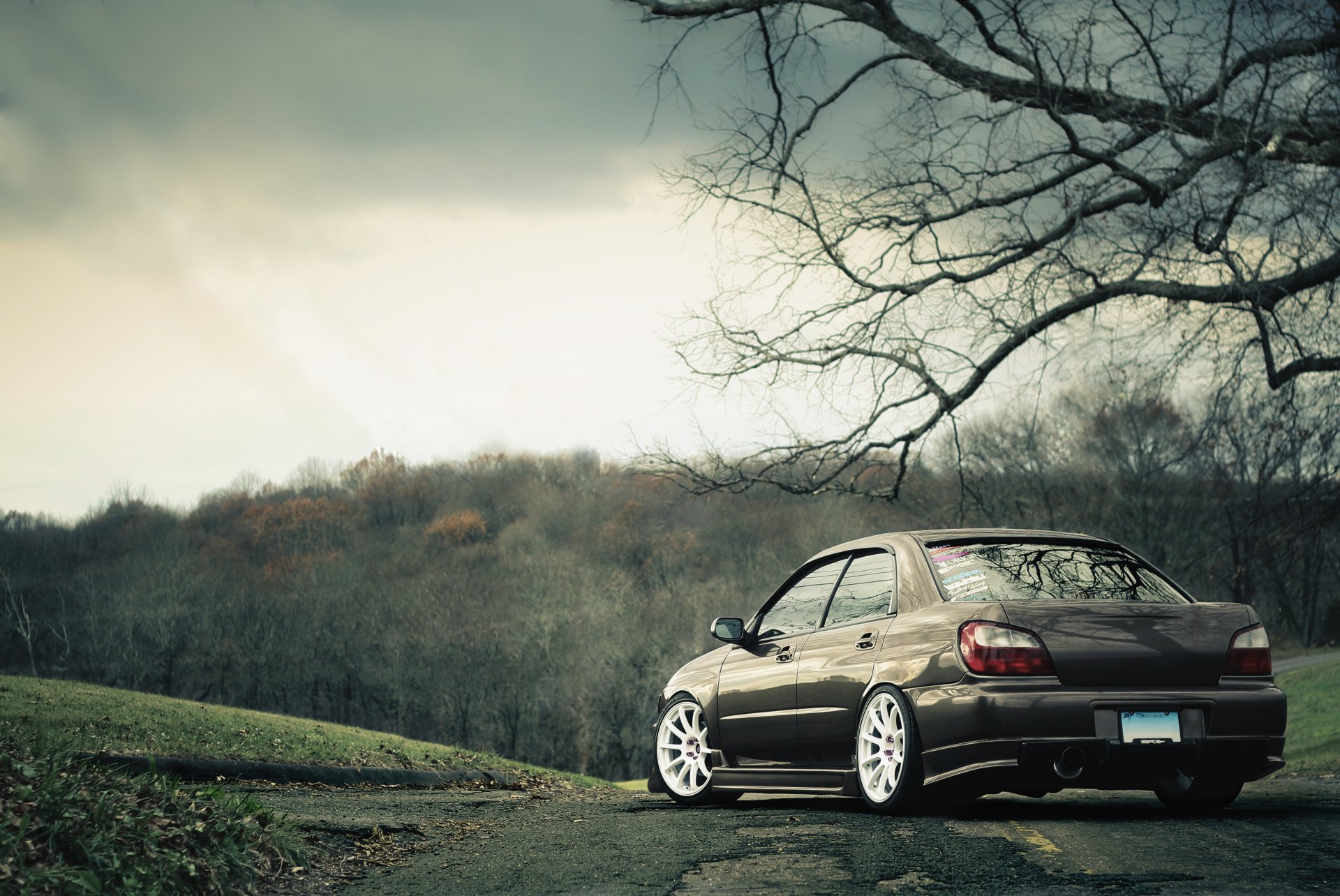Auto subaru sullo sfondo della natura autunnale - sfondo del telefono