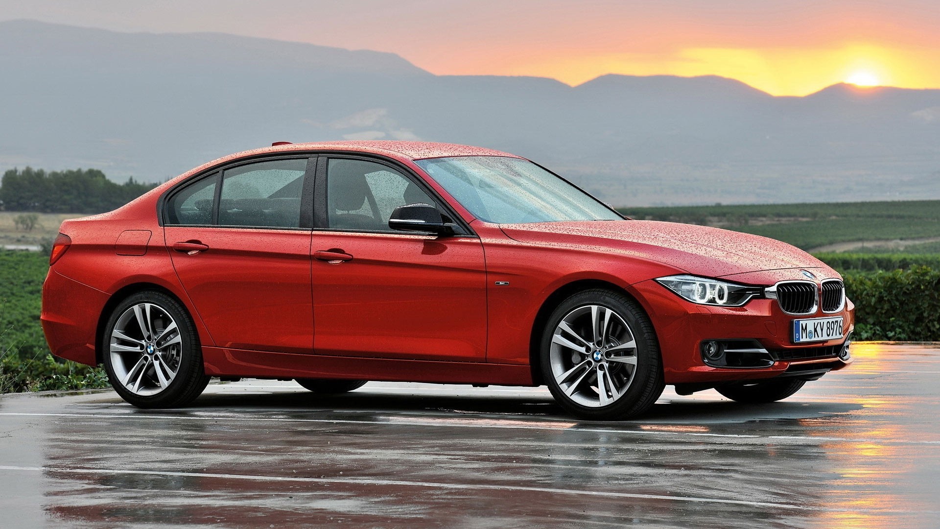 BMW rossa, berlina su asfalto bagnato - sfondo del telefono
