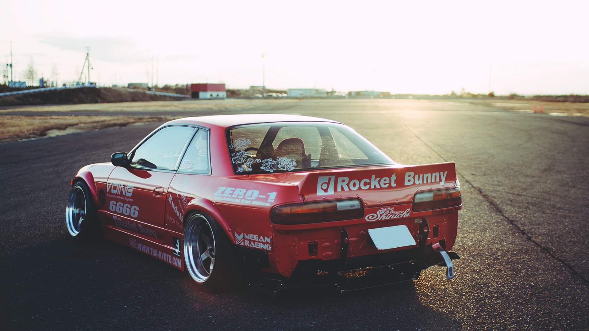 Nissan su una strada vuota sullo sfondo del tramonto - sfondo del telefono