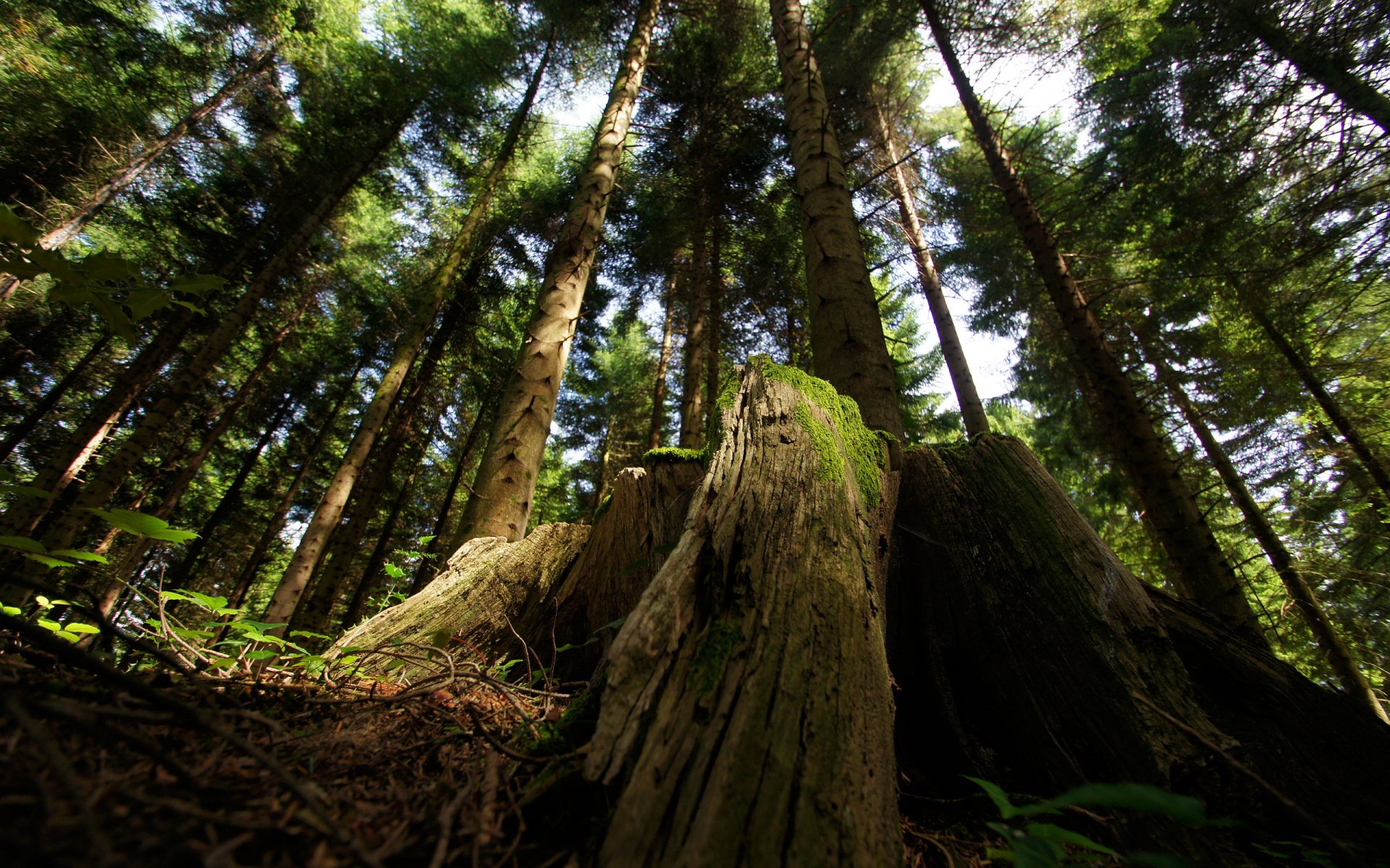 Possenti alberi su uno sfondo di cielo blu - sfondo del desktop