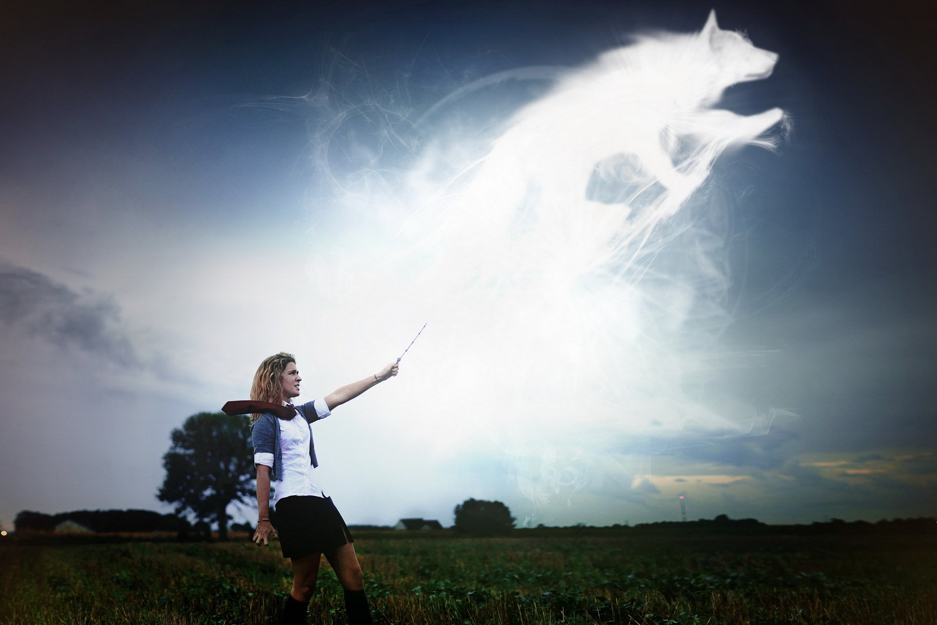 Ragazza nel campo e l immagine del lupo - sfondo del desktop