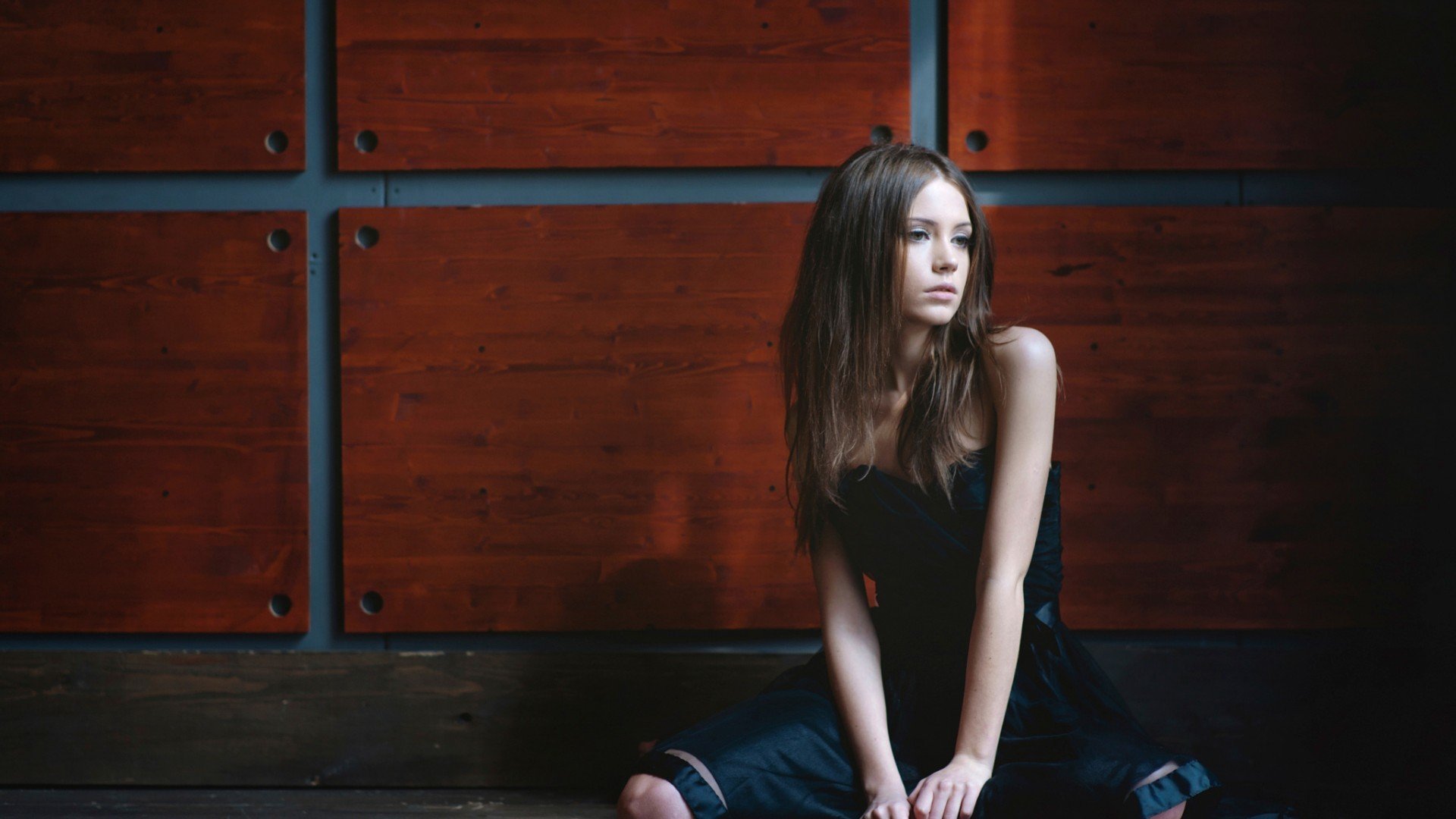 Ragazza bionda in abito bianco si siede su una recinzione su uno sfondo di alberiRagazza bionda in abito bianco si siede su una recinzione su uno sfondo di alberi