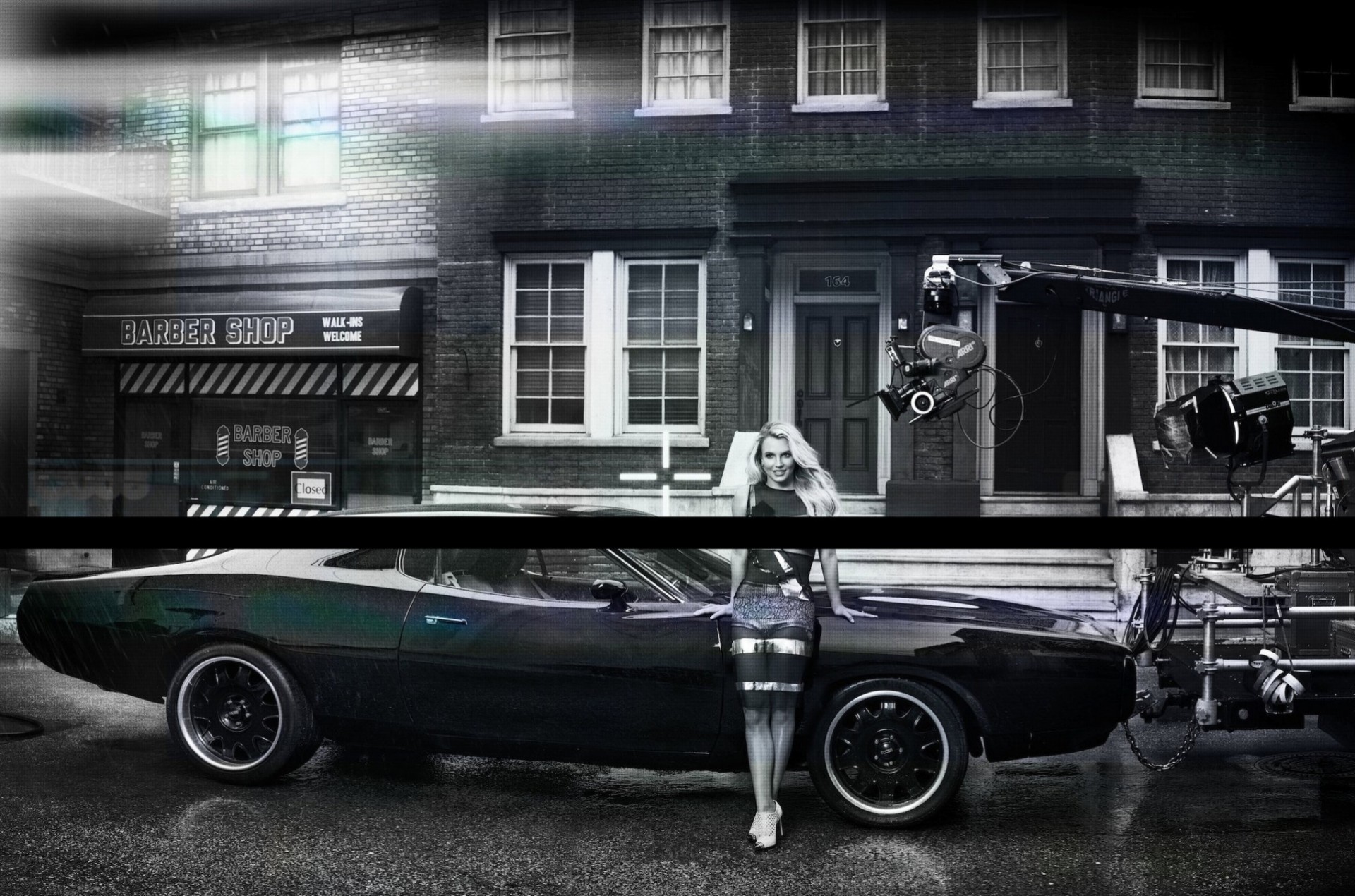 Bella ragazza in abito giallo su sfondo auto americanaBella ragazza in abito giallo su sfondo auto americana