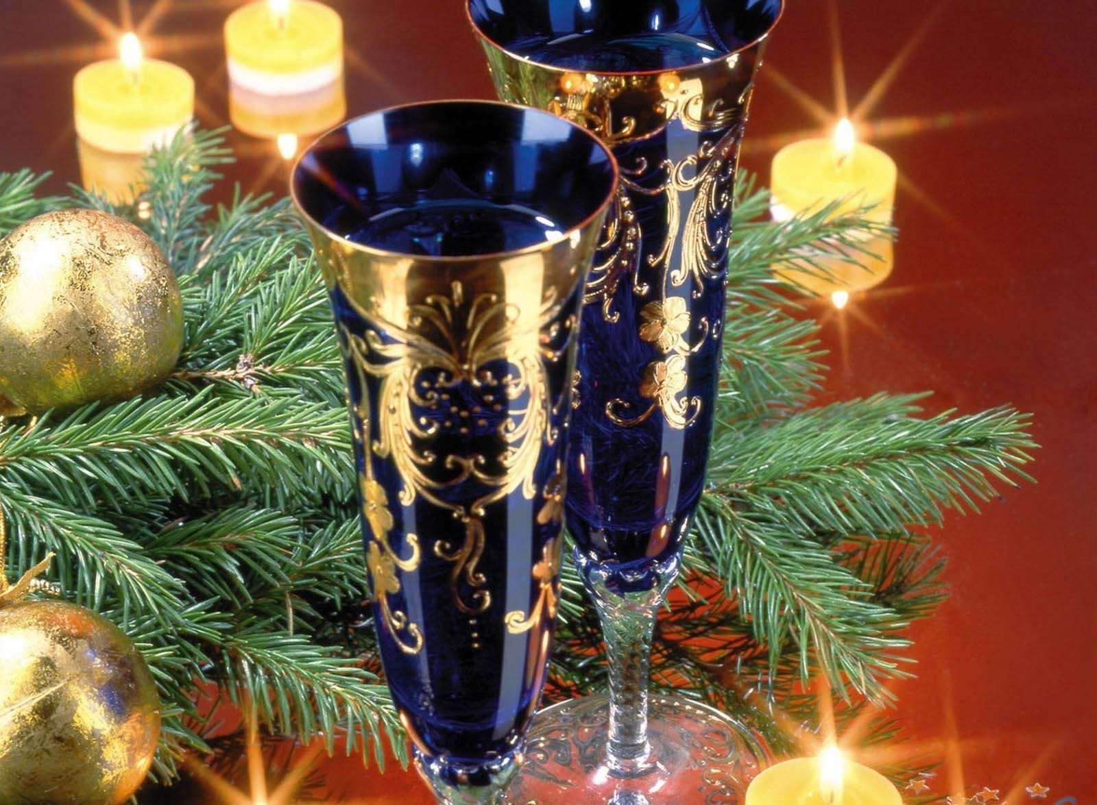 Bicchieri di capodanno con un ramo di abete rosso e palle