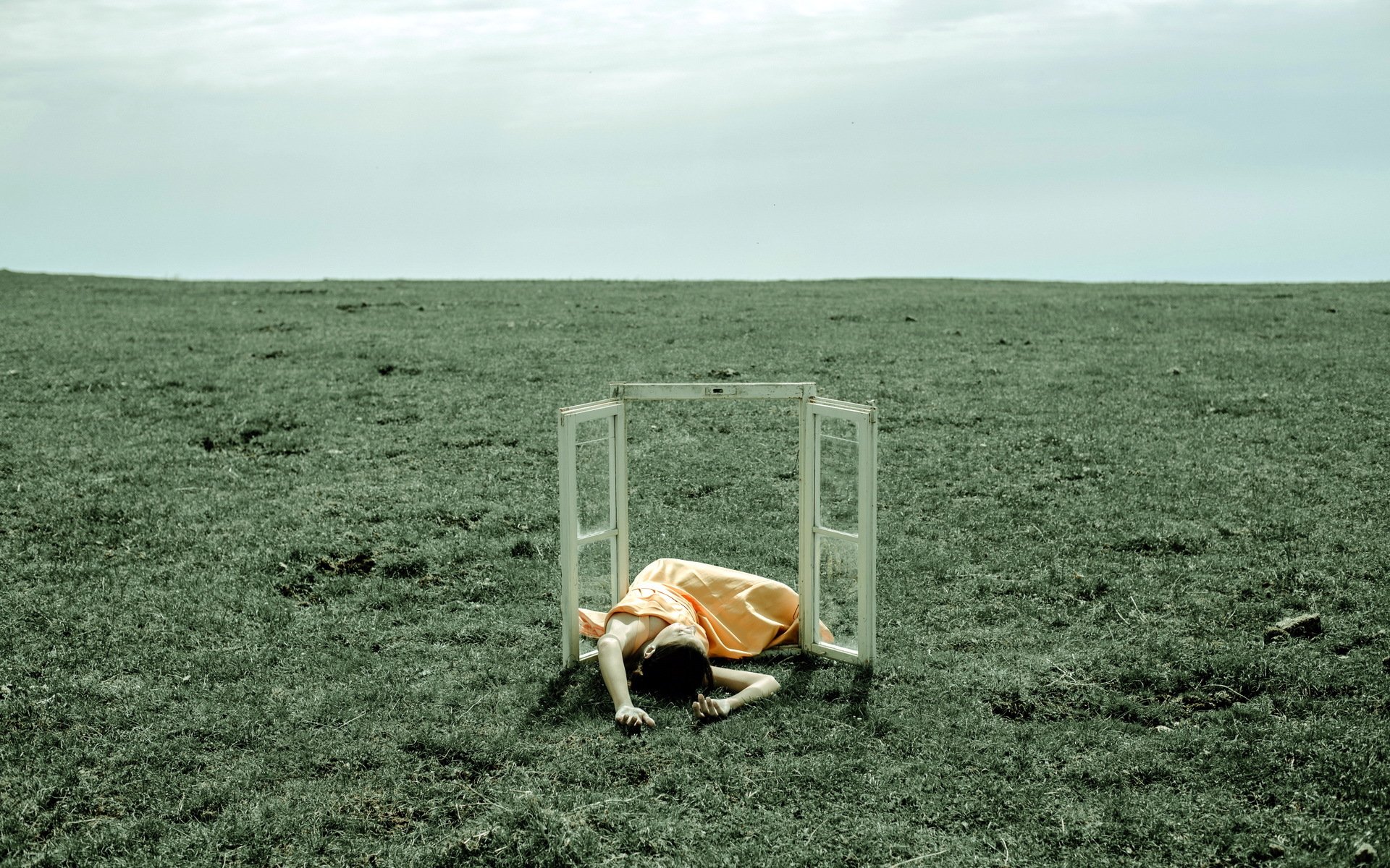 Foto di casa d'arte, persiane aperte in un campo con una ragazza in essoFoto di casa d'arte, persiane aperte in un campo con una ragazza in esso