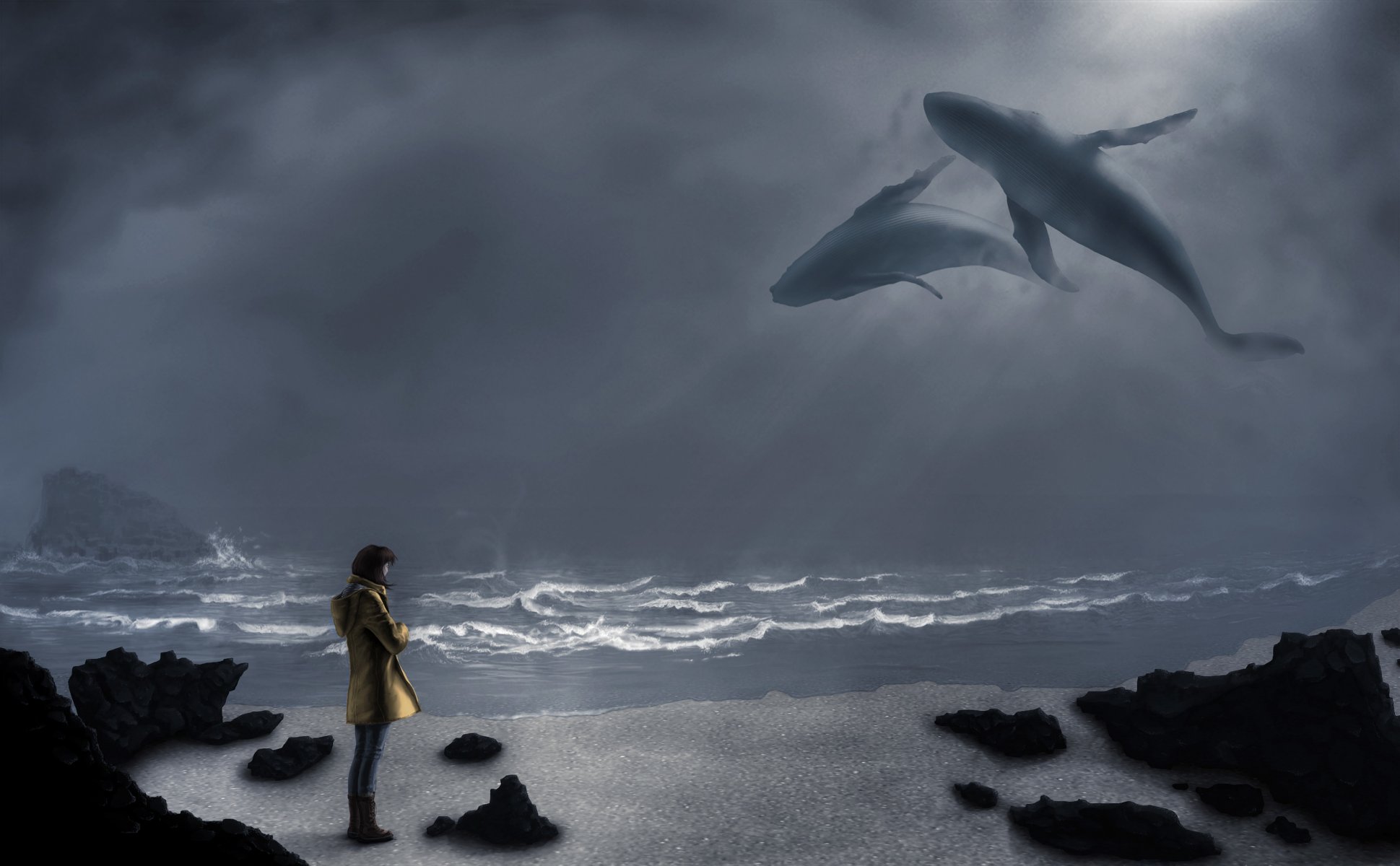 Una ragazza in un cappotto giallo sogna le balene su una riva nebbiosaUna ragazza in un cappotto giallo sogna le balene su una riva nebbiosa
