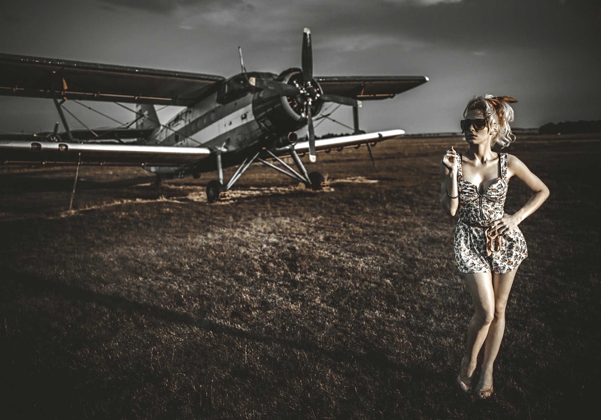 Bella bionda su sfondo biplano