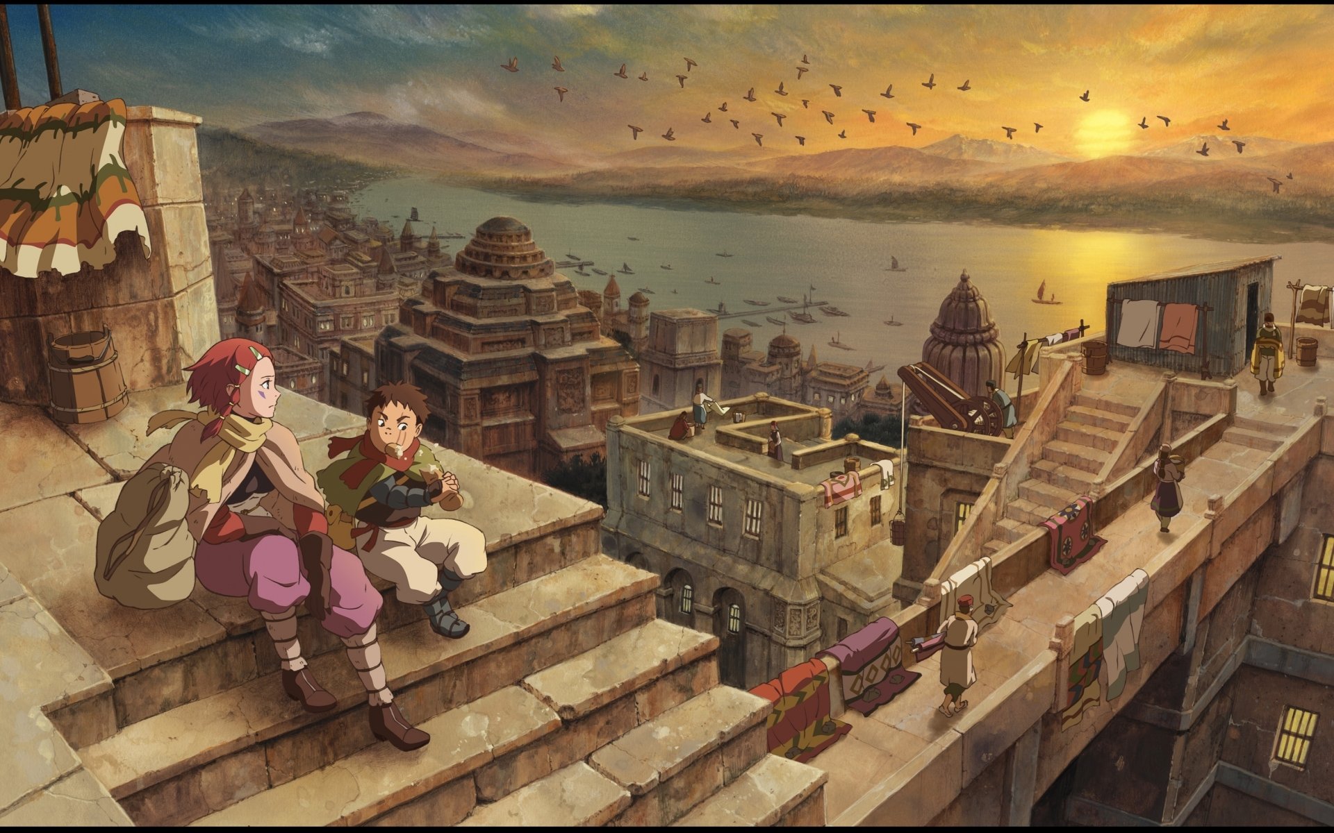 Paesaggio della città raffigurante il fiume e gli uccelli