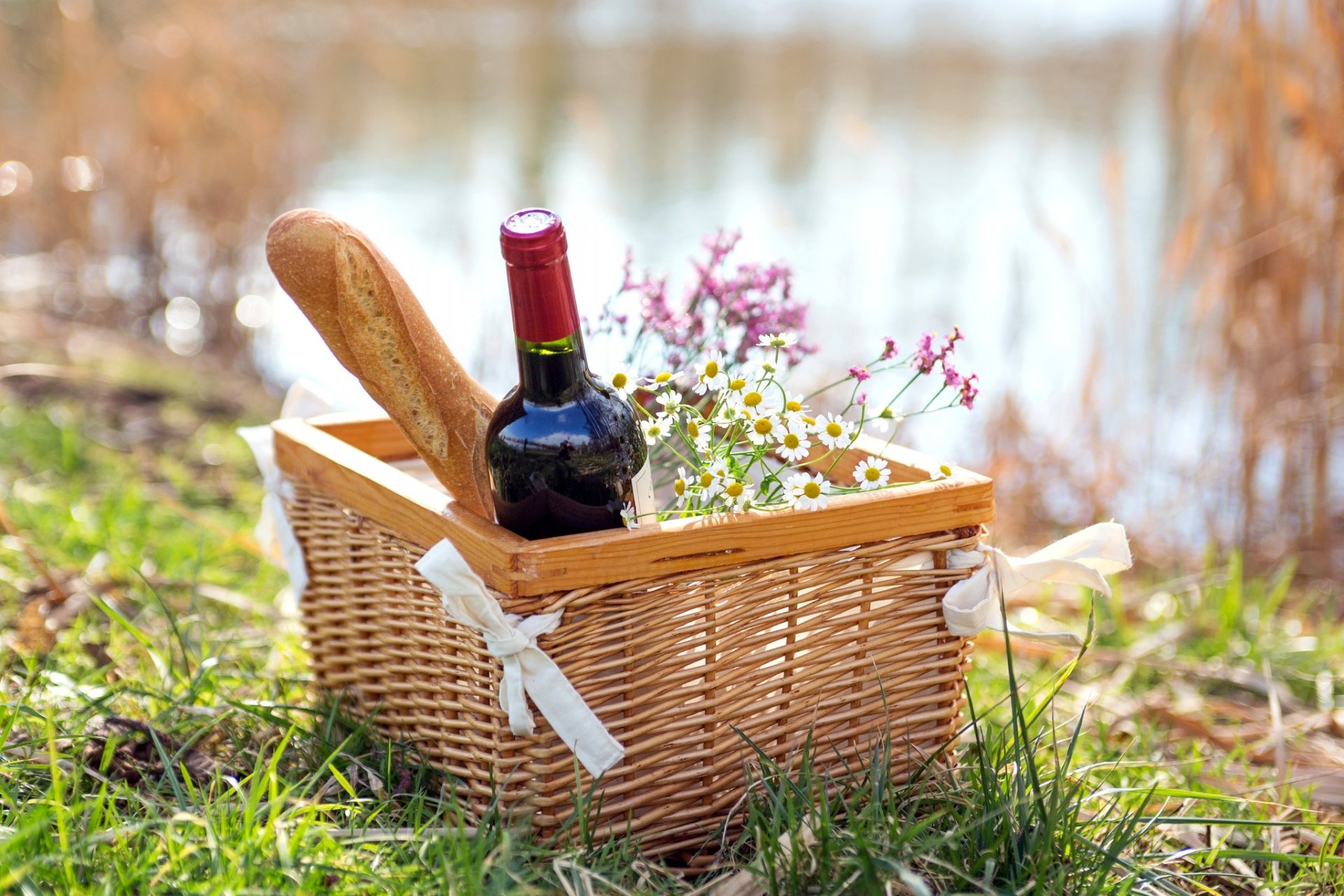 Cesto da picnic con vino e baguette sulla riva
