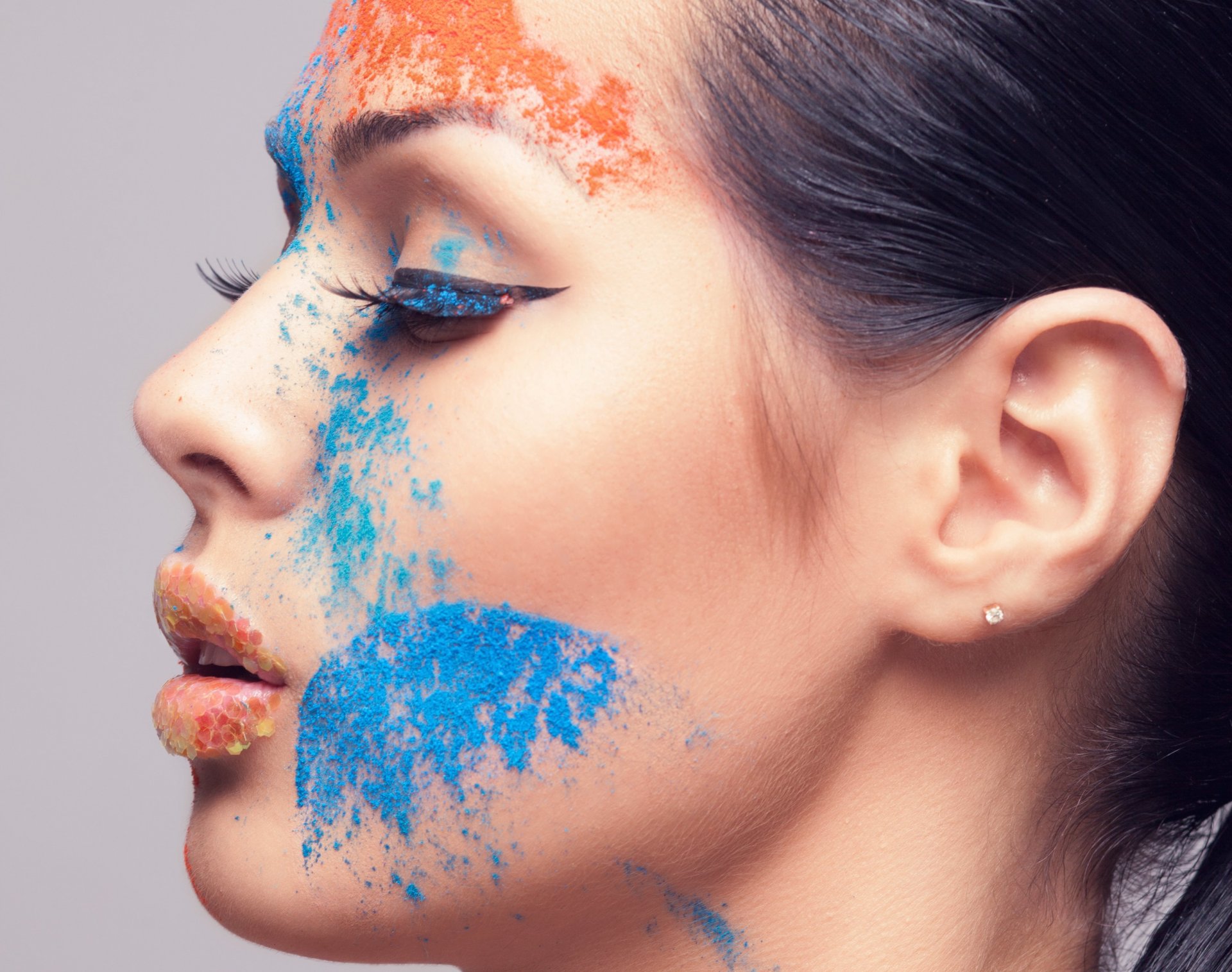 Primo piano dell'occhio della ragazza di colore blu, con ombre blu e ciglia dorate