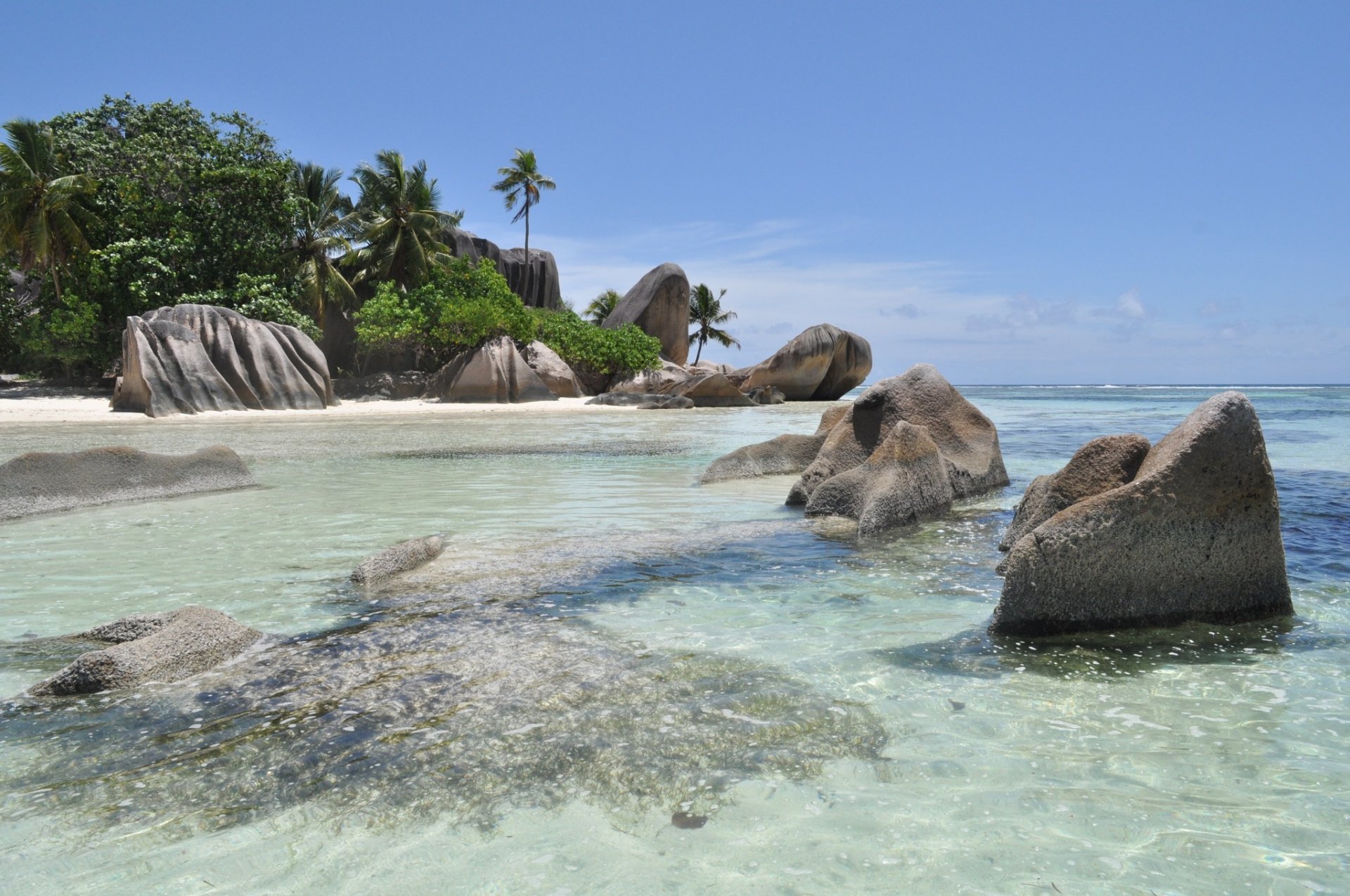 Spiaggia tropicale con acqua blu e palme