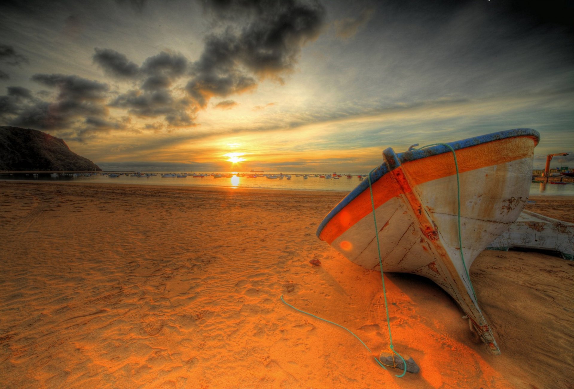 La barca giace in riva al mare ai raggi del tramonto