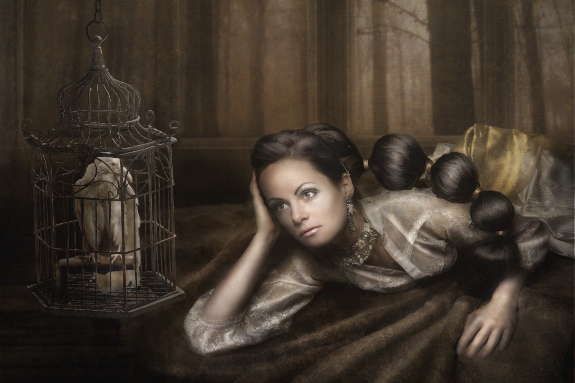Ritratto di una ragazza con i capelli neri sotto forma di un'altalena e un corvo seduto su di loroRitratto di una ragazza con i capelli neri sotto forma di un'altalena e un corvo seduto su di loro