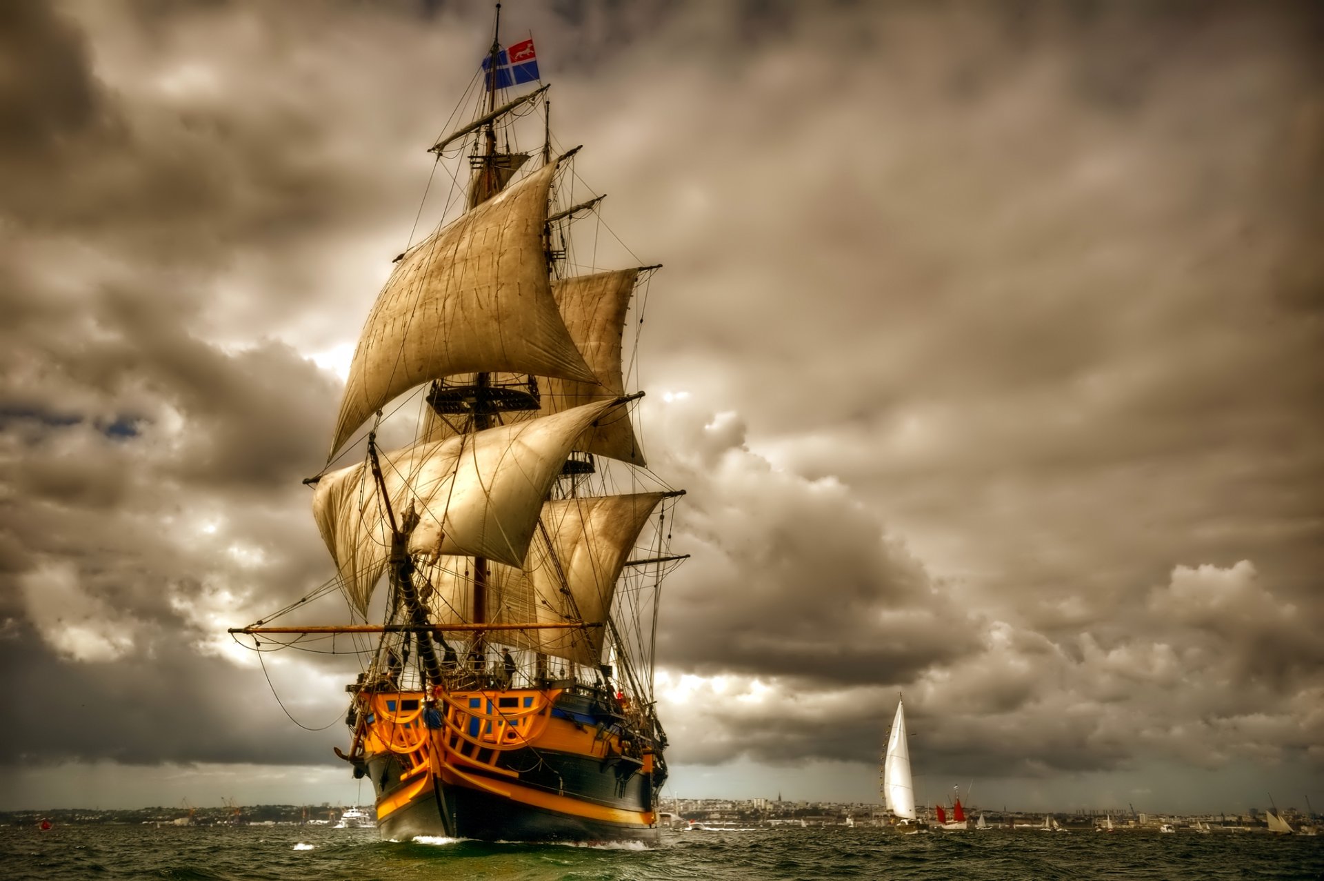 Sullo sfondo di nuvole temporalesche, una nave galleggiaSullo sfondo di nuvole temporalesche, una nave galleggia