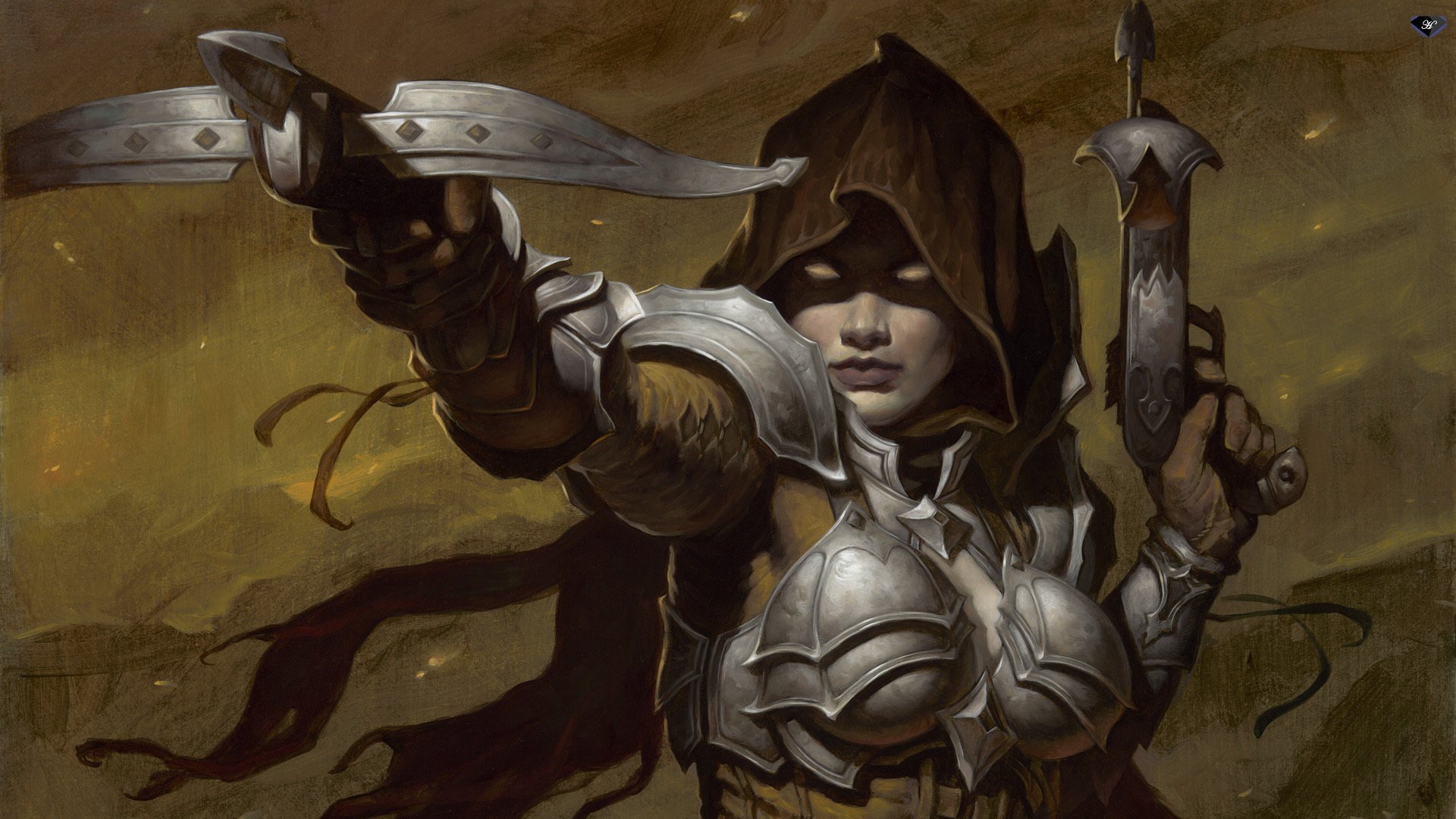 Donna in armatura con balestre spara al nemico