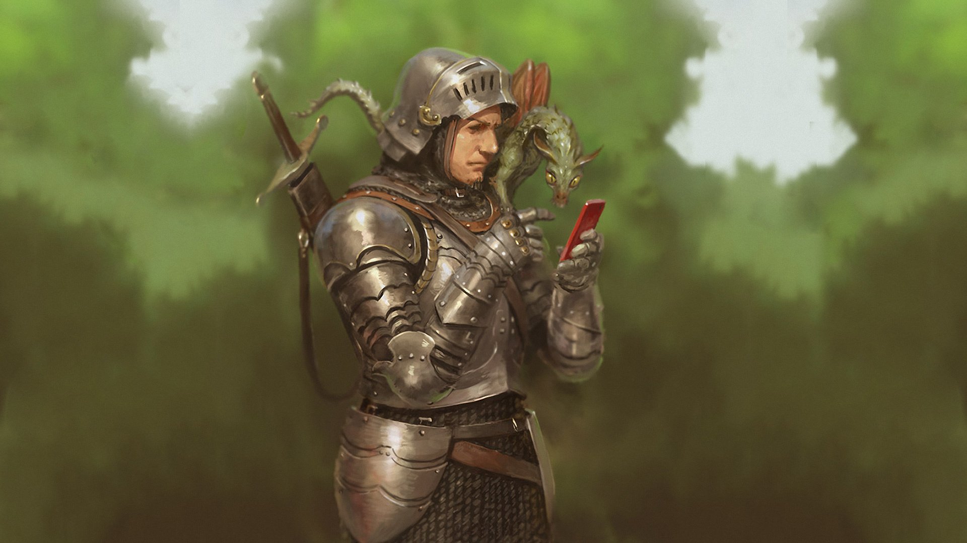 Cavaliere che guarda in uno smartphone con un drago sulla spalla