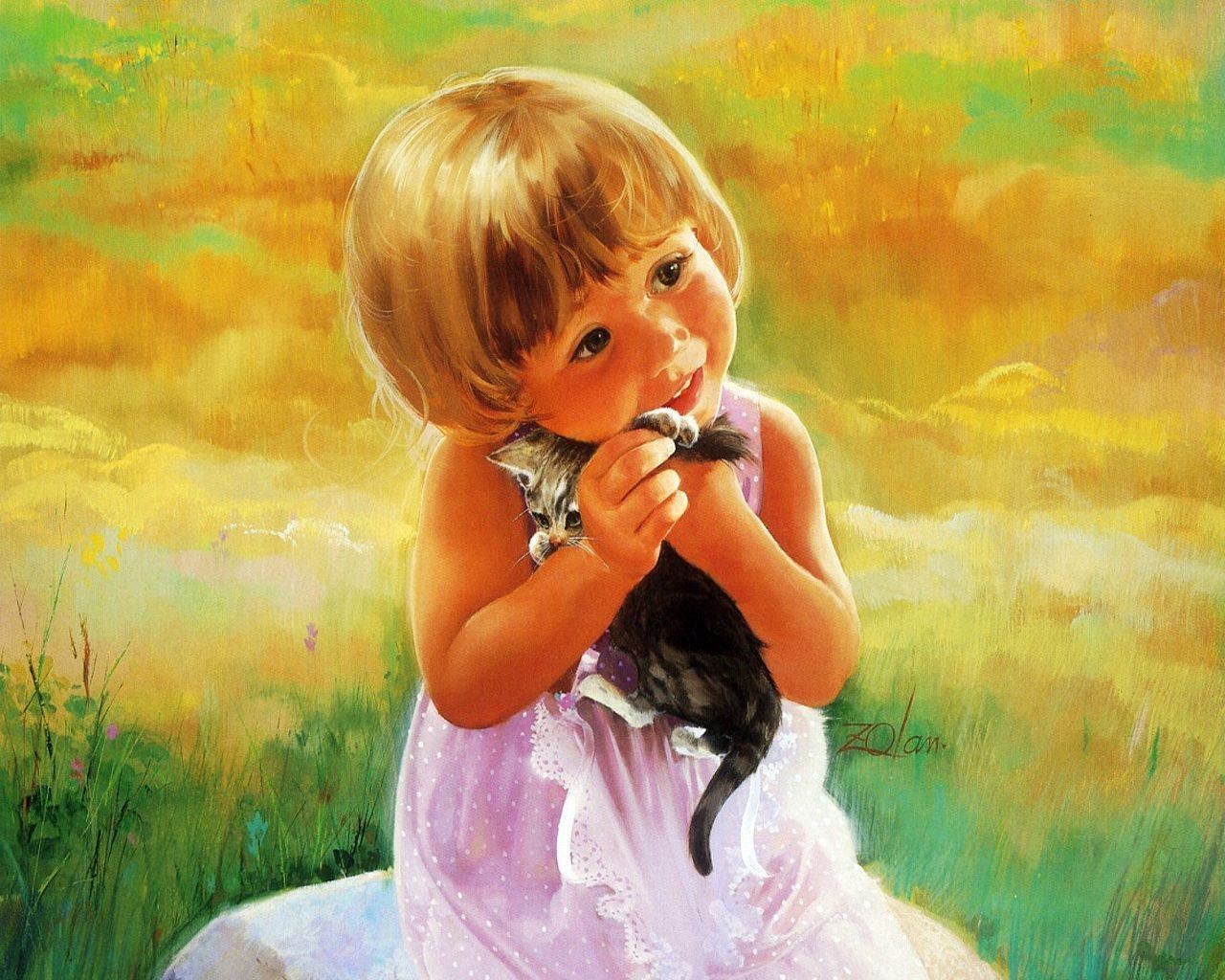 Una ragazza carina con lunghi capelli blu corre gioiosamente attraverso un campo di fiori inondato dal soleUna ragazza carina con lunghi capelli blu corre gioiosamente attraverso un campo di fiori inondato dal sole