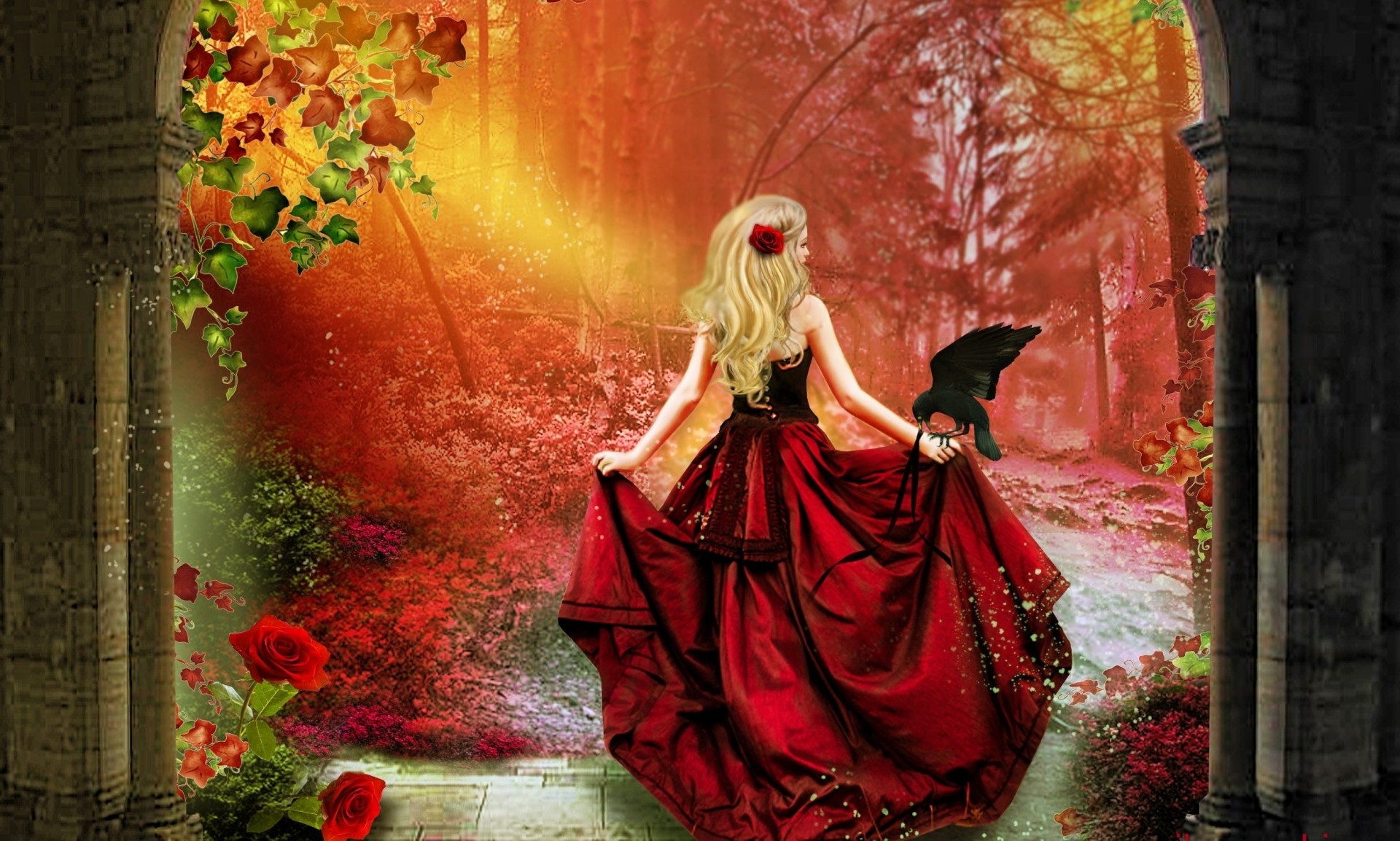 Fantasmagoria. Ragazza in abito rosso nella foresta