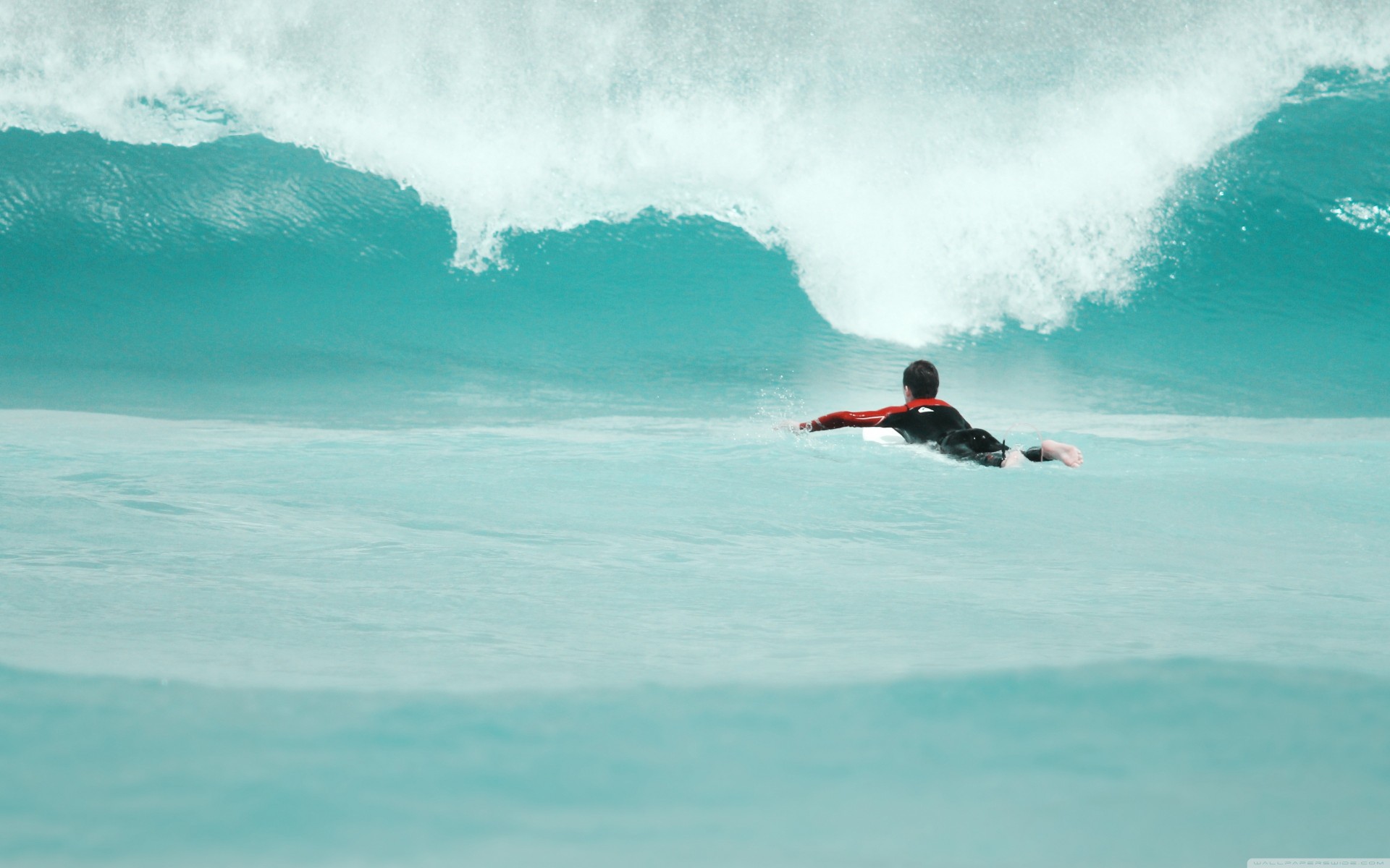 Surfista che nuota su un'onda di colore azzurro