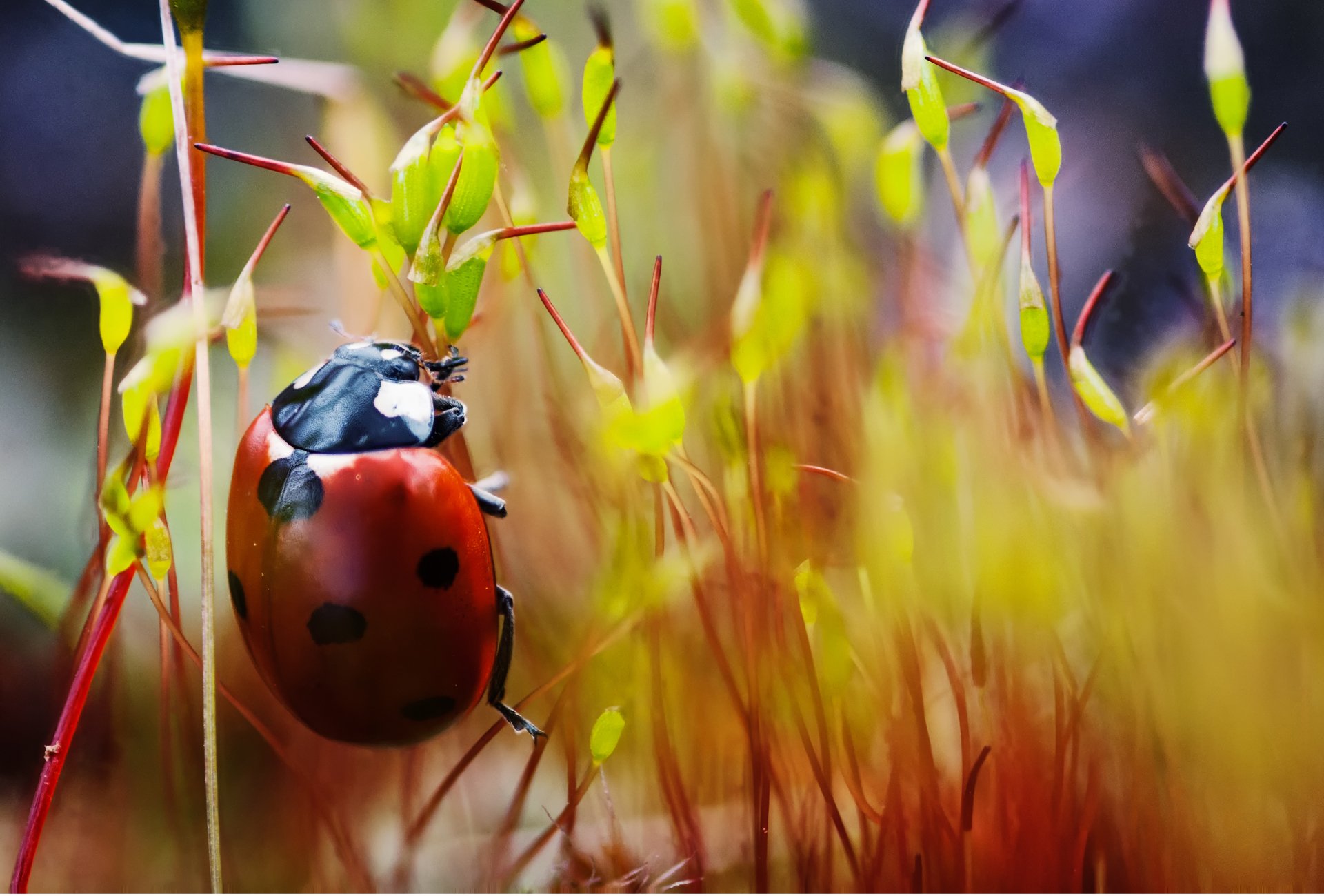 Foto di una coccinella che striscia su un filo d'erbaFoto di una coccinella che striscia su un filo d'erba