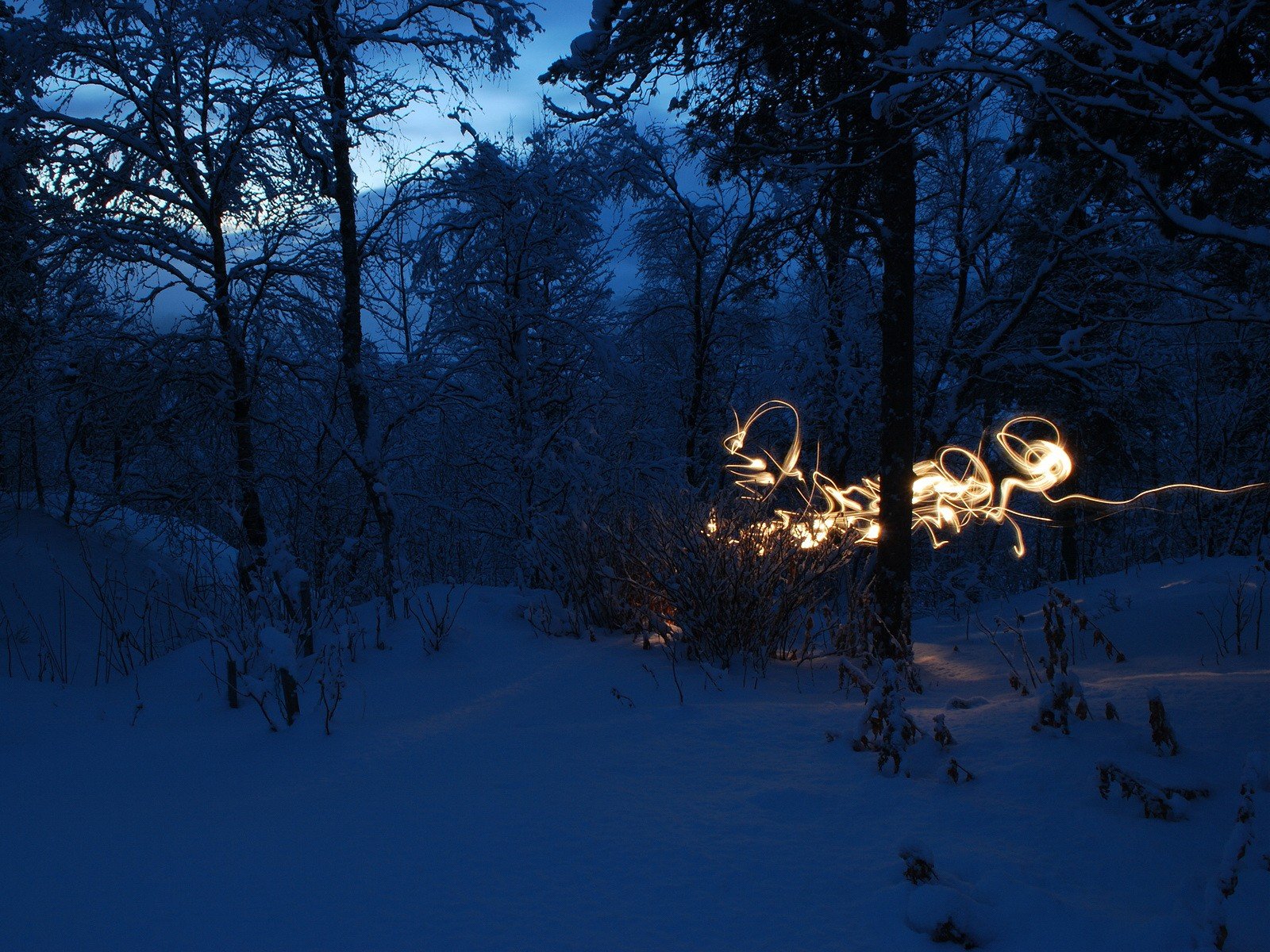 Bella foresta innevata al crepuscolo