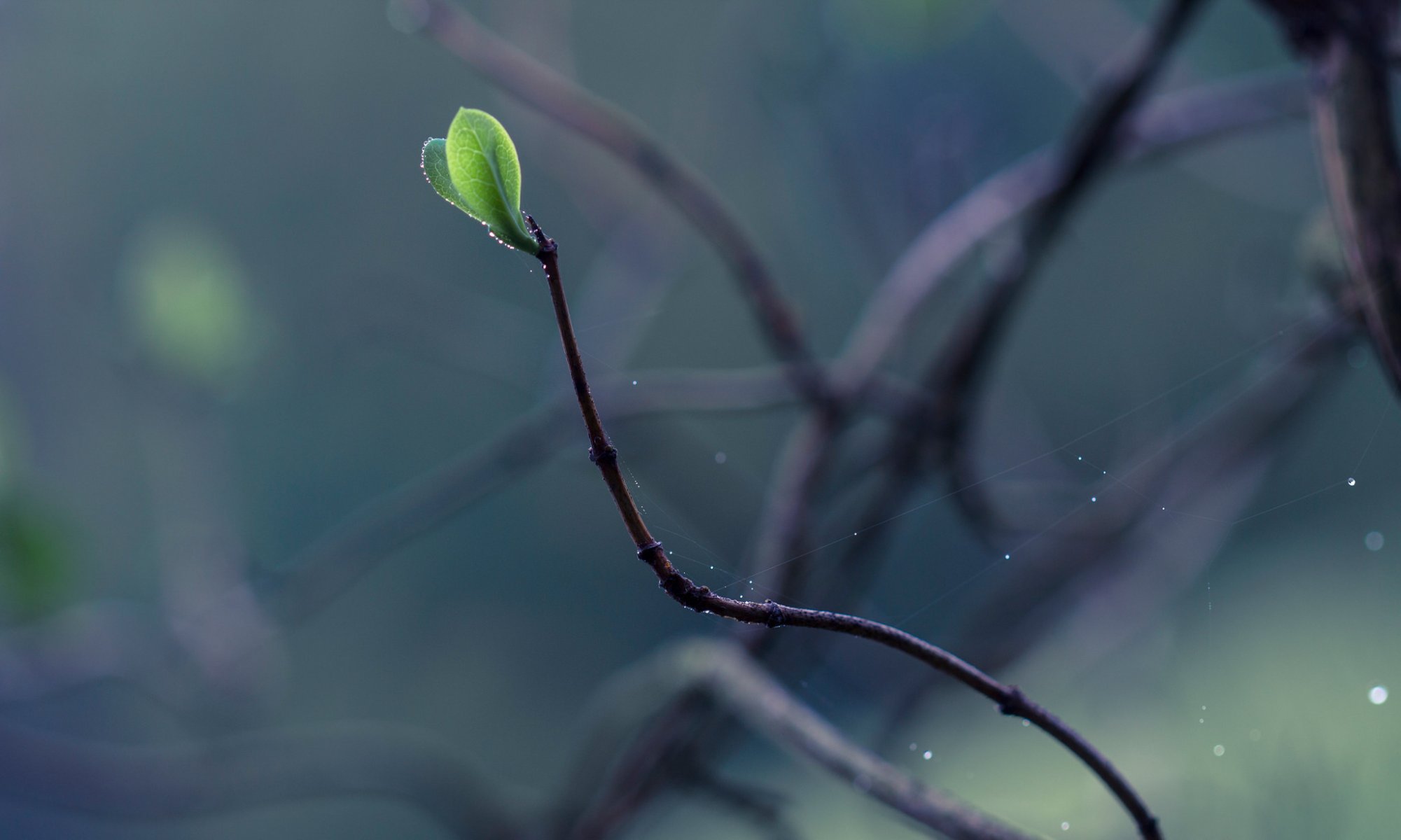 Fotografia macro di un ramo con foglie e ragnateleFotografia macro di un ramo con foglie e ragnatele