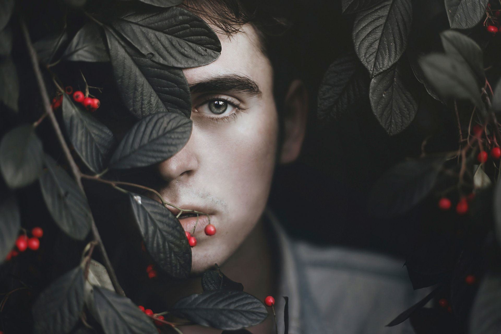 Il genitore guarda da dietro l'albero con le bacche rosseIl genitore guarda da dietro l'albero con le bacche rosse
