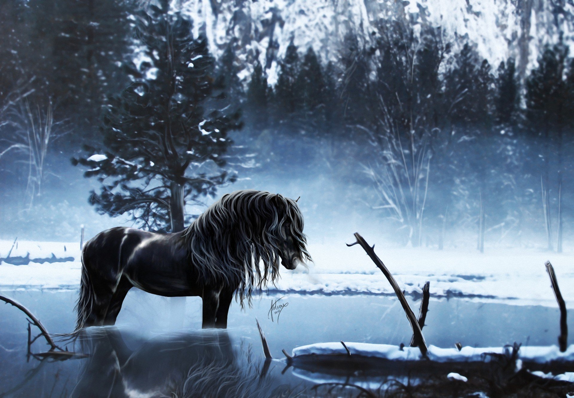 Cavallo nero in un lago ghiacciato nella foresta notte d'invernoCavallo nero in un lago ghiacciato nella foresta notte d'inverno
