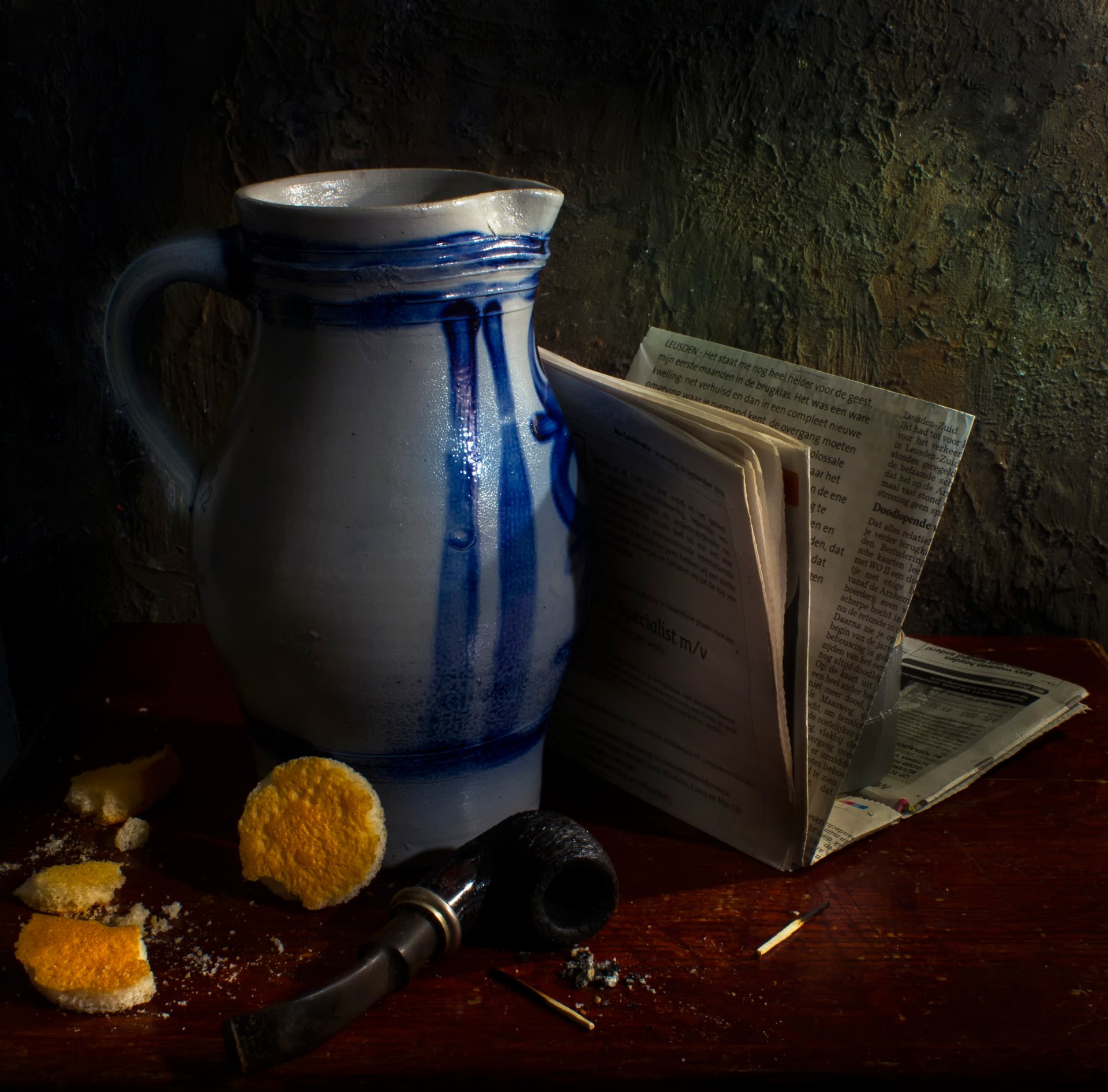 Una tazza di caffè con un piccolo biscotto è sul tavolo, accanto a: giornale, bicchieri e un bicchiere con un fioreUna tazza di caffè con un piccolo biscotto è sul tavolo, accanto a: giornale, Bicchieri e un bicchiere con un fiore