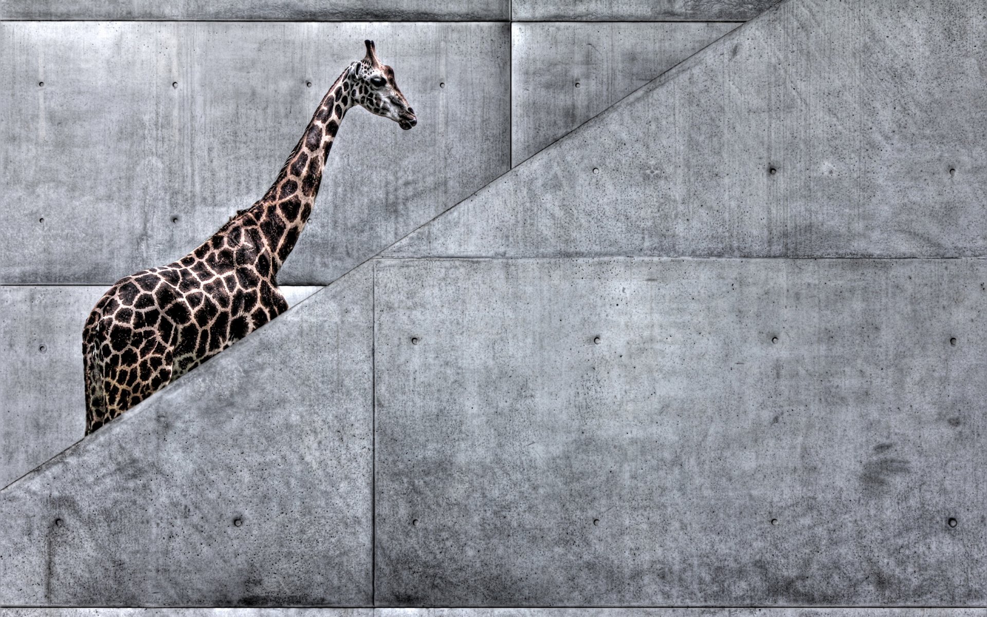 Una giraffa la cui parte inferiore si trova sotto la pioggia e la testa sopra le nuvole
