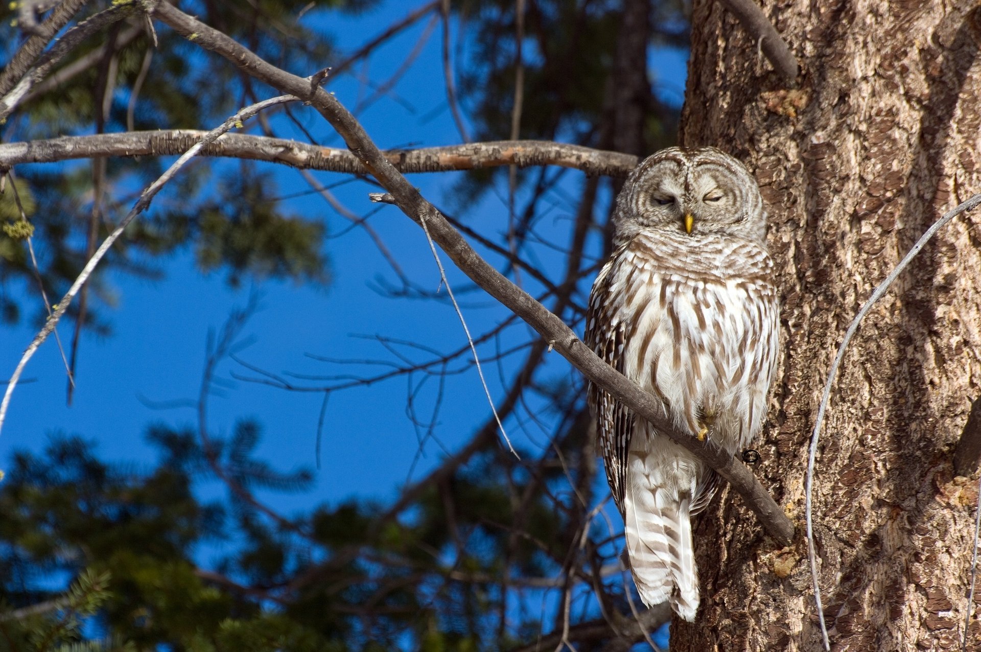 Uccello Gufo seduto su un albero secco