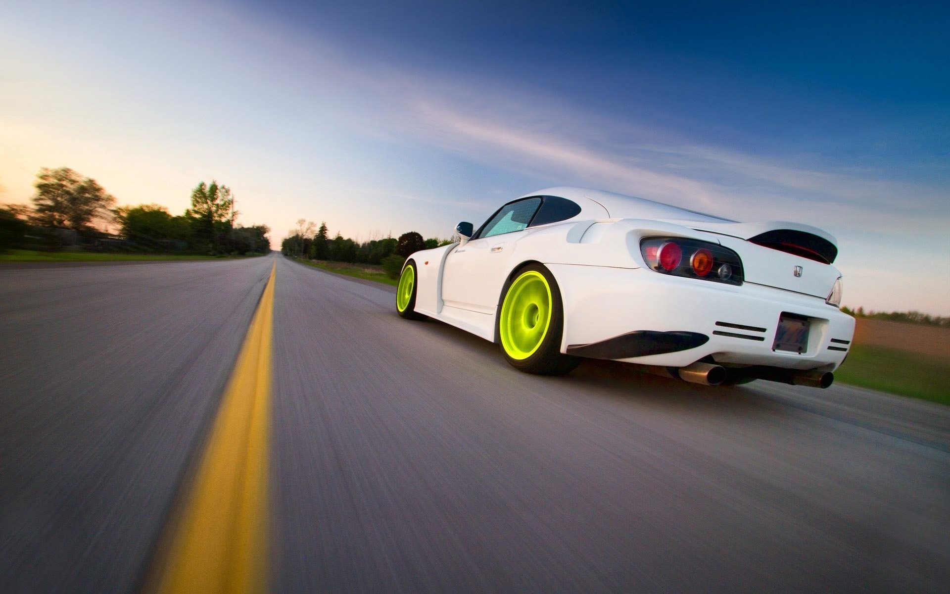 Honda bianca sportiva con ruote verdi