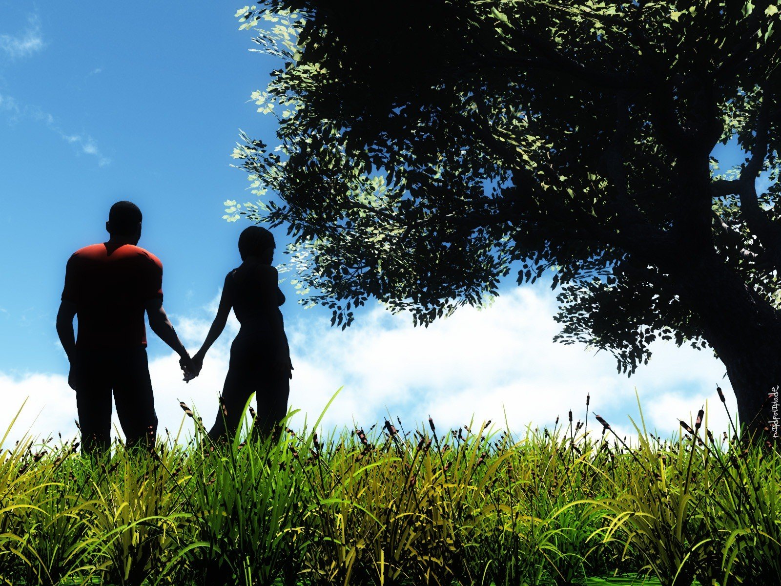 Coppia nella natura in piedi sotto un grande alberoCoppia nella natura in piedi sotto un grande albero
