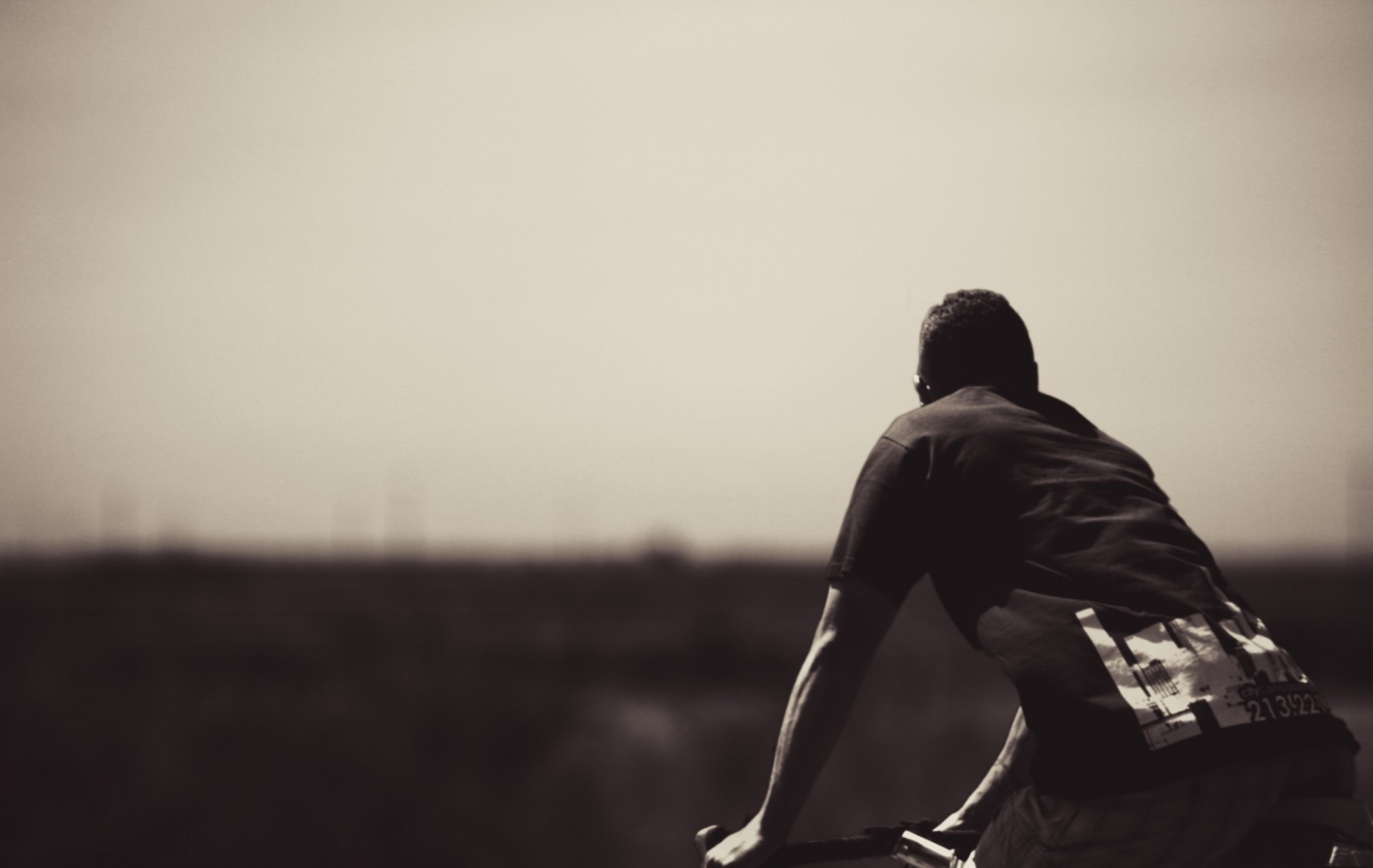 L'uomo ha fermato la bicicletta e guarda in lontananzaL'uomo ha fermato la bicicletta e guarda in lontananza