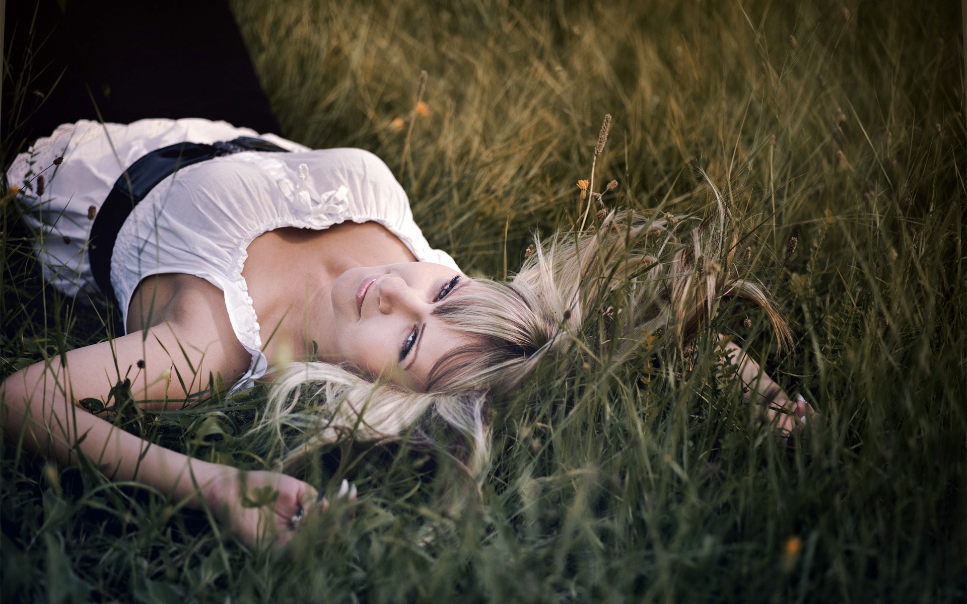 La ragazza si trova con gli occhi chiusi nell'erbaLa ragazza si trova con gli occhi chiusi nell'erba