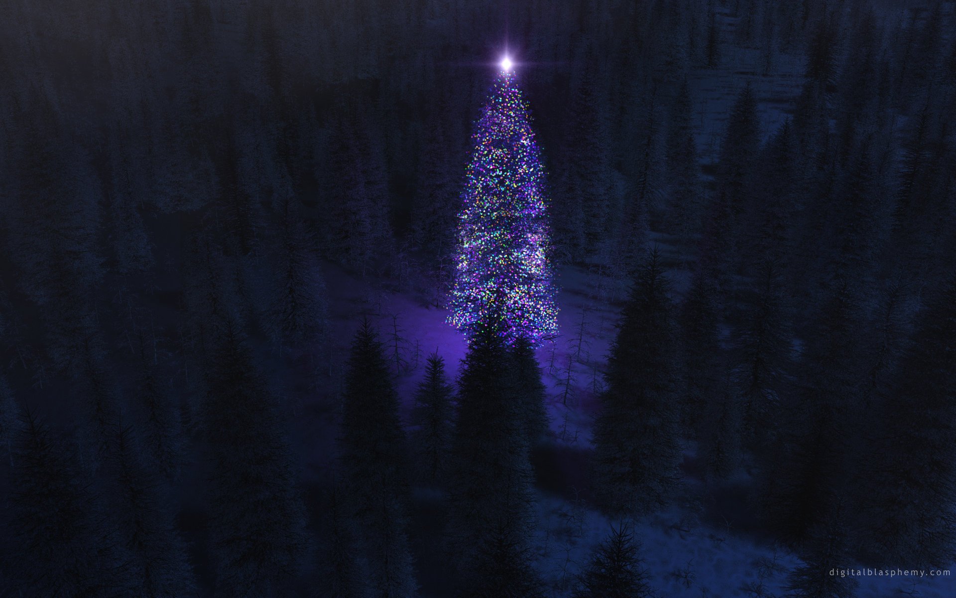 Albero di natale con luci di notte nella foresta oscuraAlbero di Natale con luci di notte nella foresta oscura
