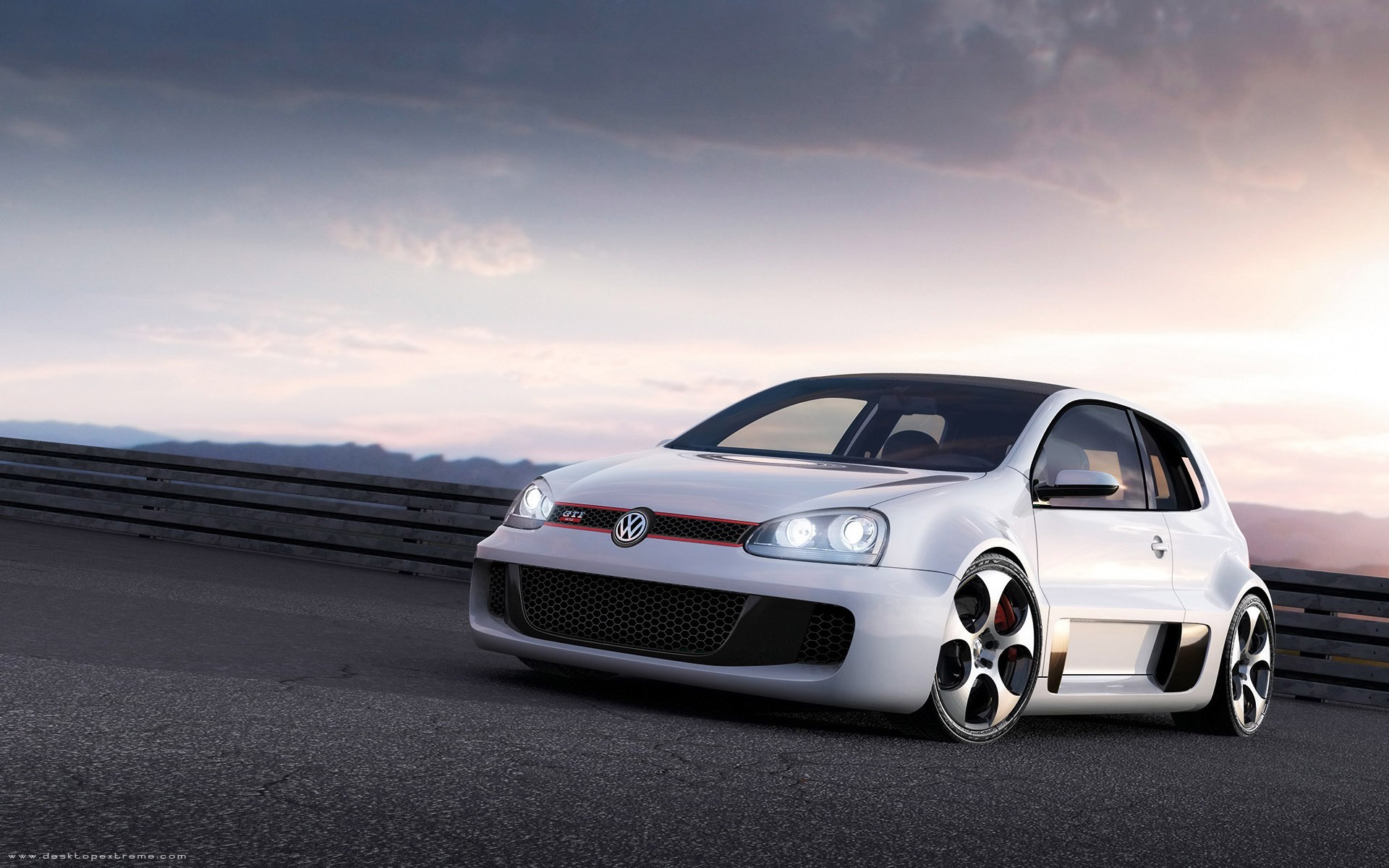 Volkswagen golf davanti al ponte della città notturna vicino al fiume