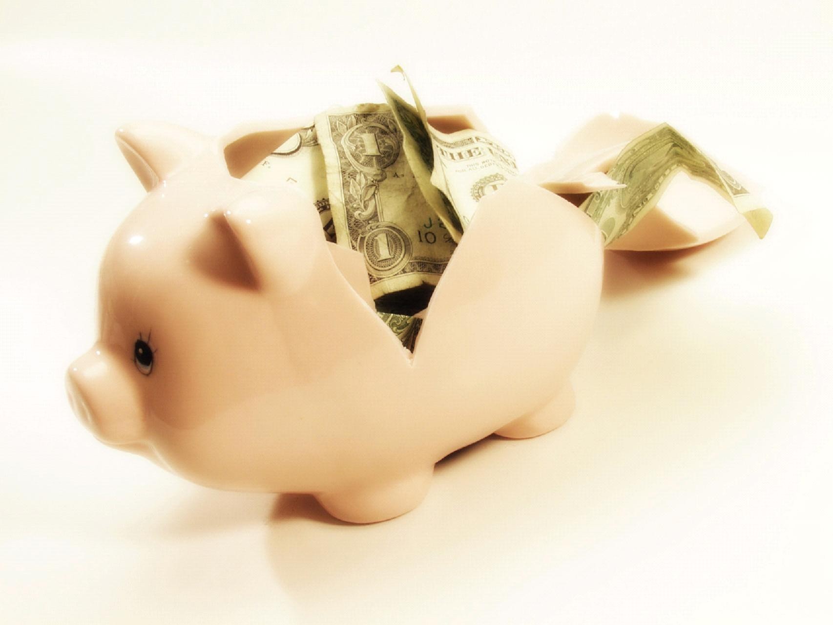 Piggy maiale rotto con dollari all'interno su sfondo bianco