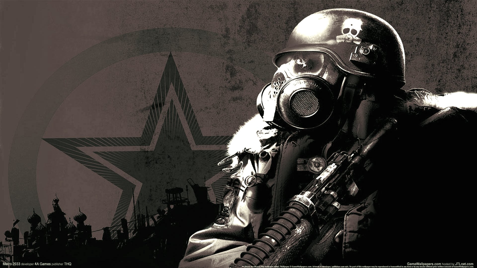 Sulle rovine di una città in rovina sopravvissuto di,, metropolitana,, ranger in maschera antigas e con le armi in manoSulle rovine di una città in rovina sopravvissuto di,, metropolitana,, Ranger in maschera antigas e con le armi in mano