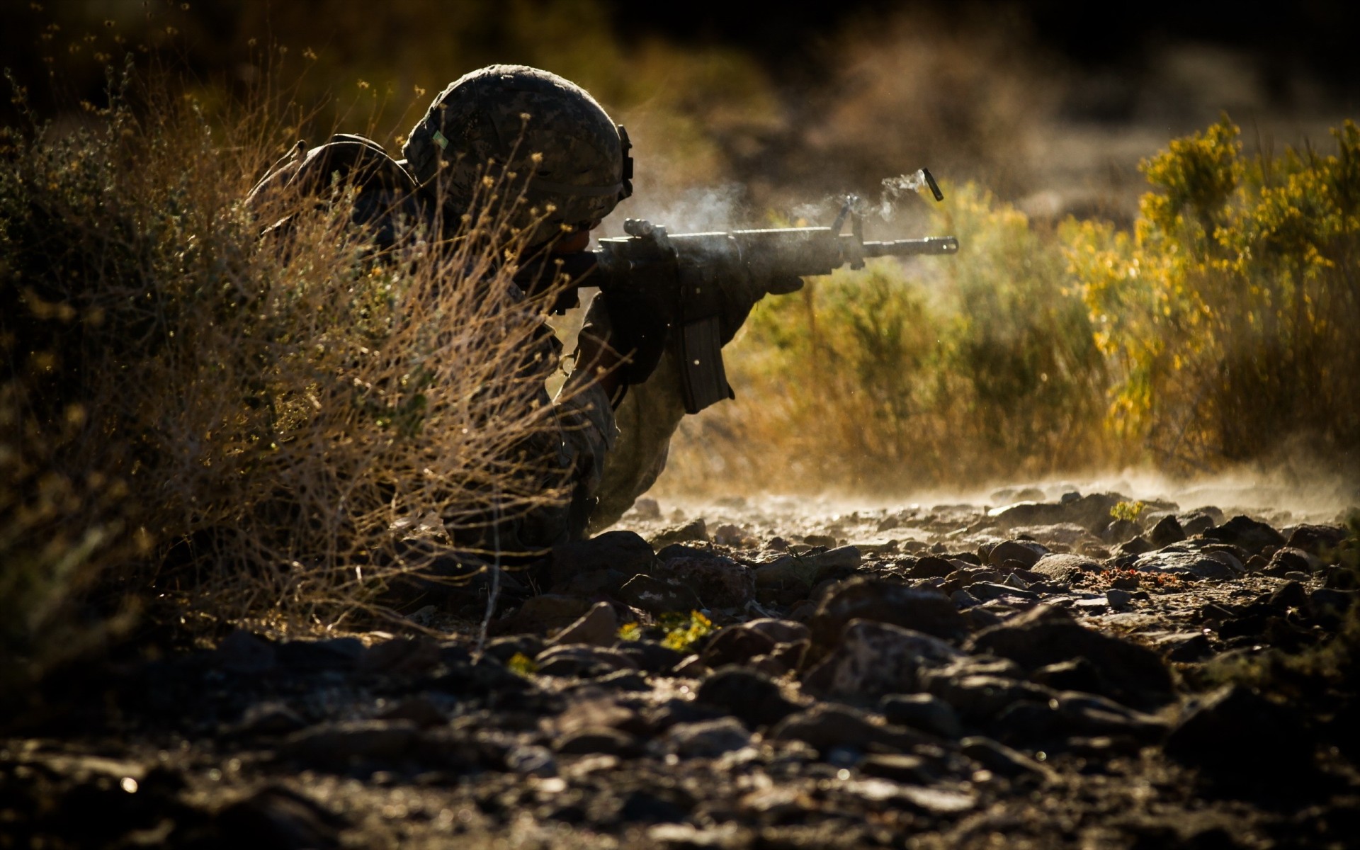 Un soldato con un elmetto spara da una mitragliatriceUn soldato con un elmetto spara da una mitragliatrice