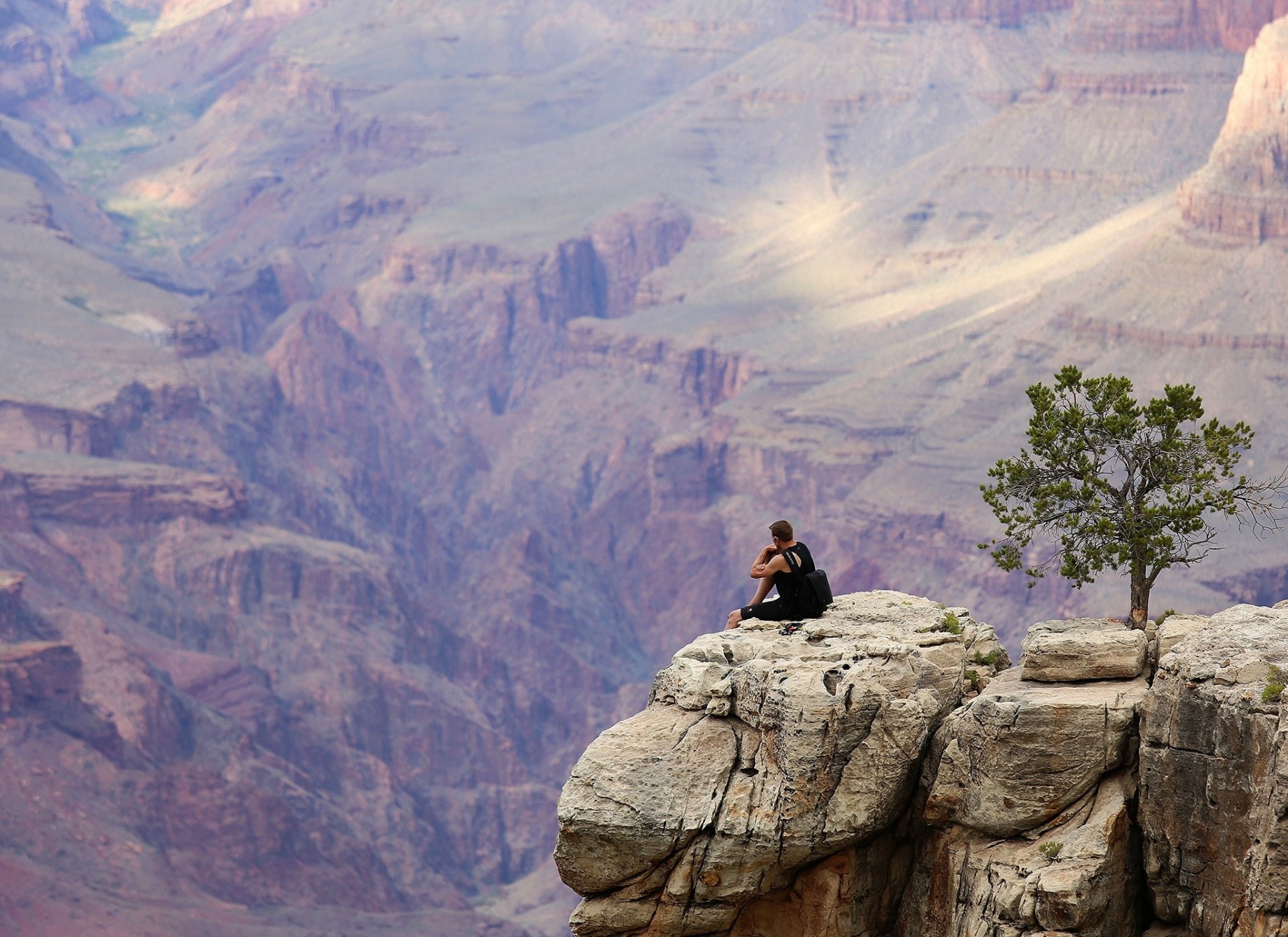 L'uomo si siede su una scogliera in una bella canienneL'uomo si siede su una scogliera in una bella canienne