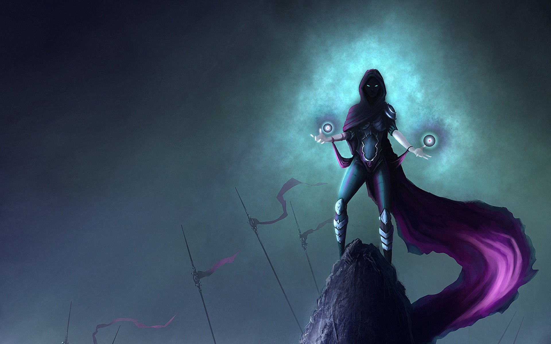 Misteriosa ragazza con gli occhi ardenti e ciuffi di energia nei palmi delle mani, in piedi su una collina in un lungo mantello violaMisteriosa ragazza con gli occhi ardenti e ciuffi di energia nei palmi delle mani, in piedi su una collina in un lungo mantello viola