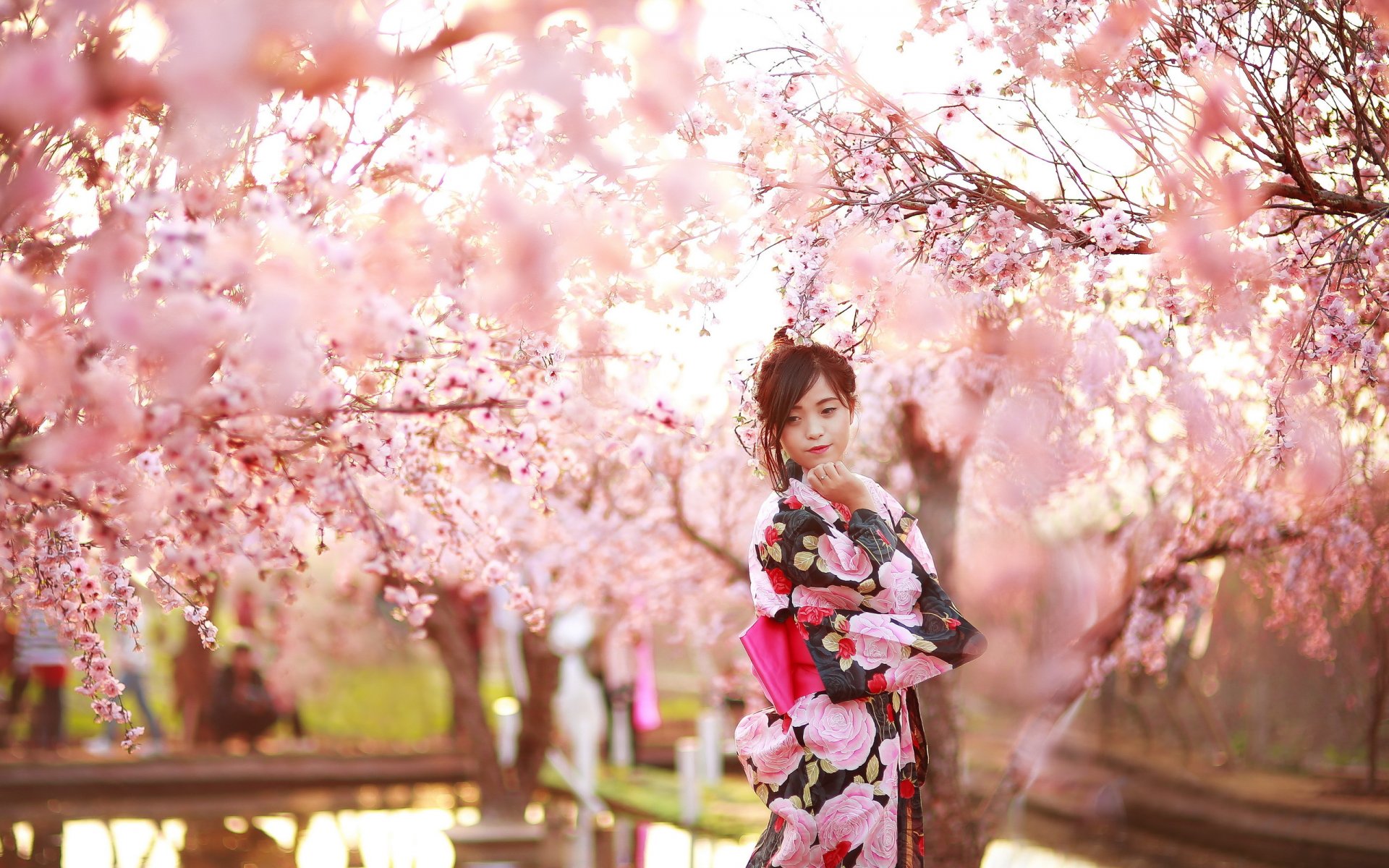 Asiatico in piedi sotto i fiori di ciliegio