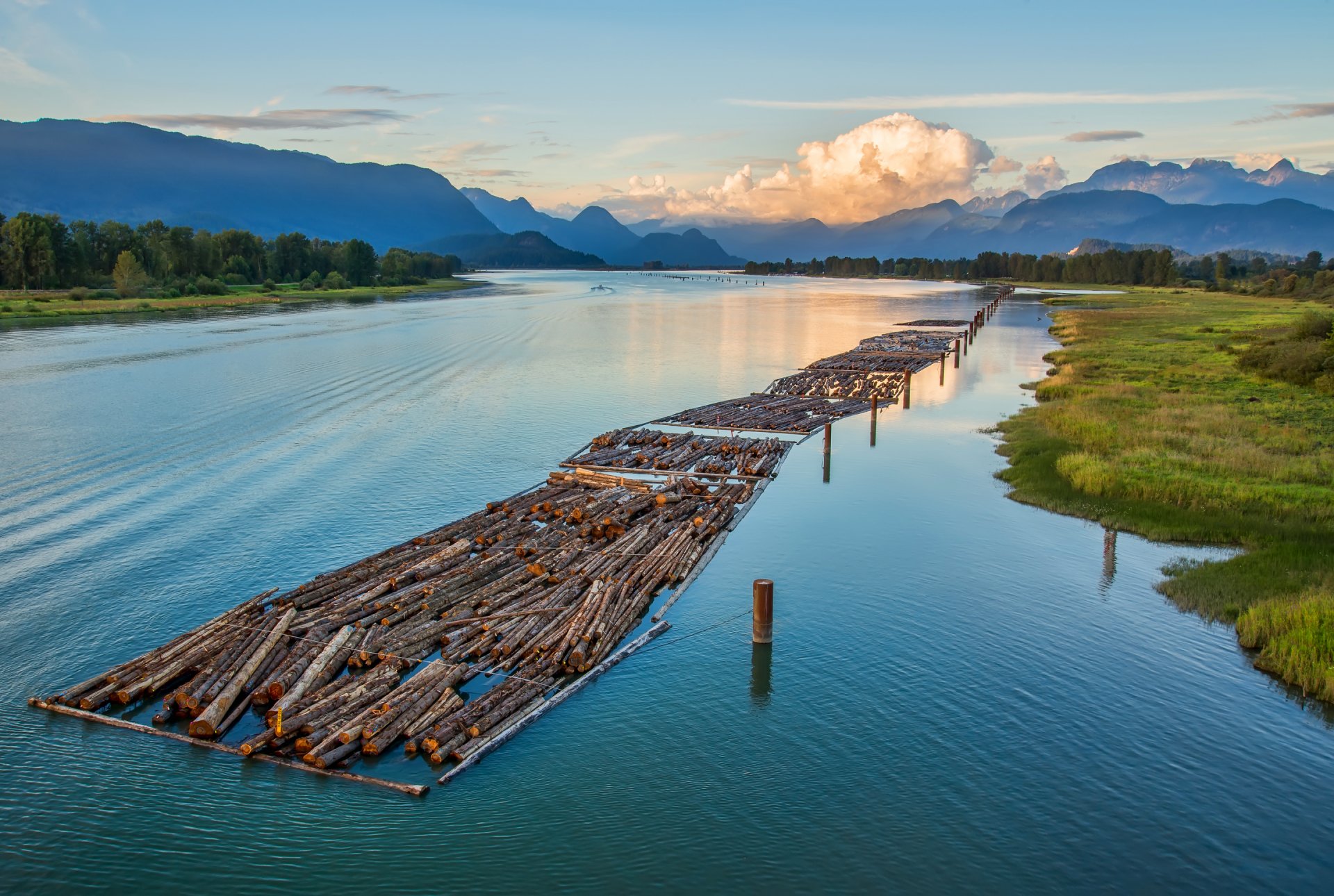Tronchi d'acqua nella columbia britannica. foresta e montagne all'orizzonteTronchi d'acqua nella Columbia Britannica. Foresta e montagne all'orizzonte