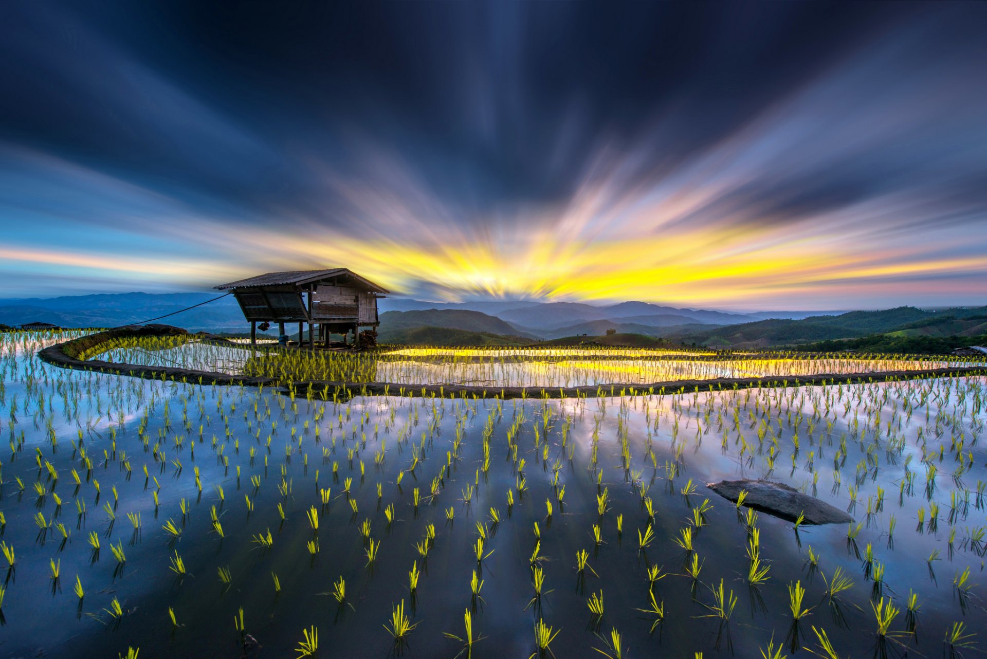 Casetta sullo sfondo di un campo con germogli di pianteCasetta sullo sfondo di un campo con germogli di piante