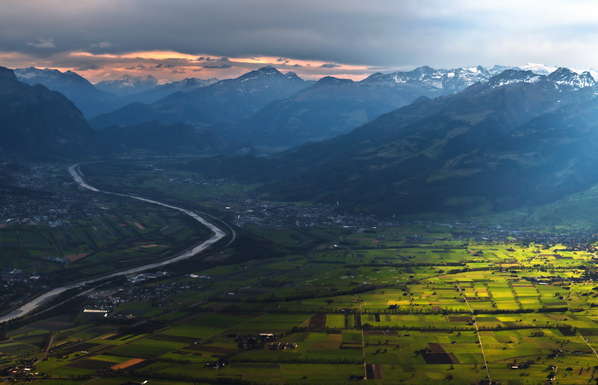 Cielo arancione durante il tramonto, valle con erbaCielo arancione durante il tramonto, valle con erba