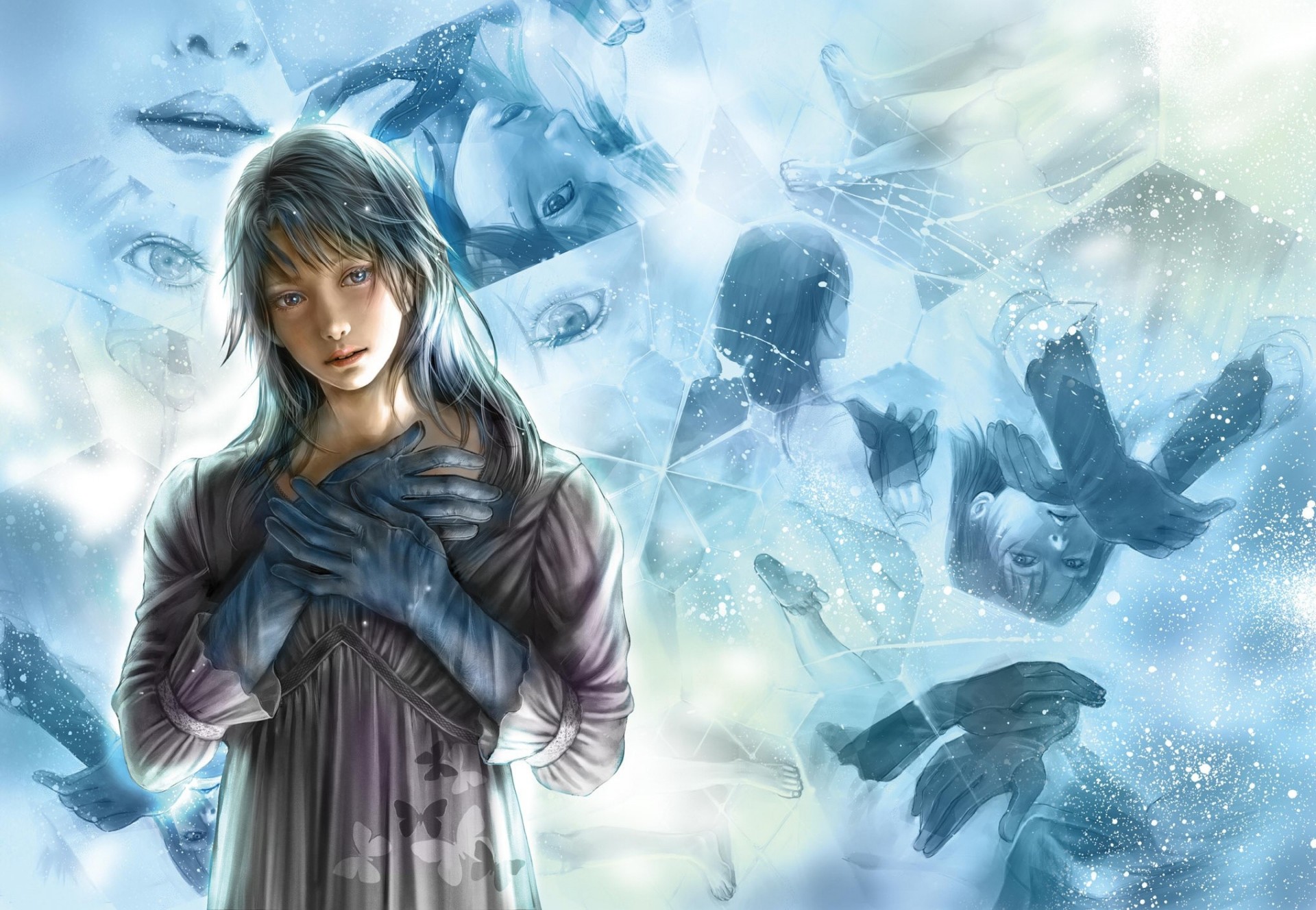 Ragazza triste in guanti neri in posa sullo sfondo di schizzi di se stessa