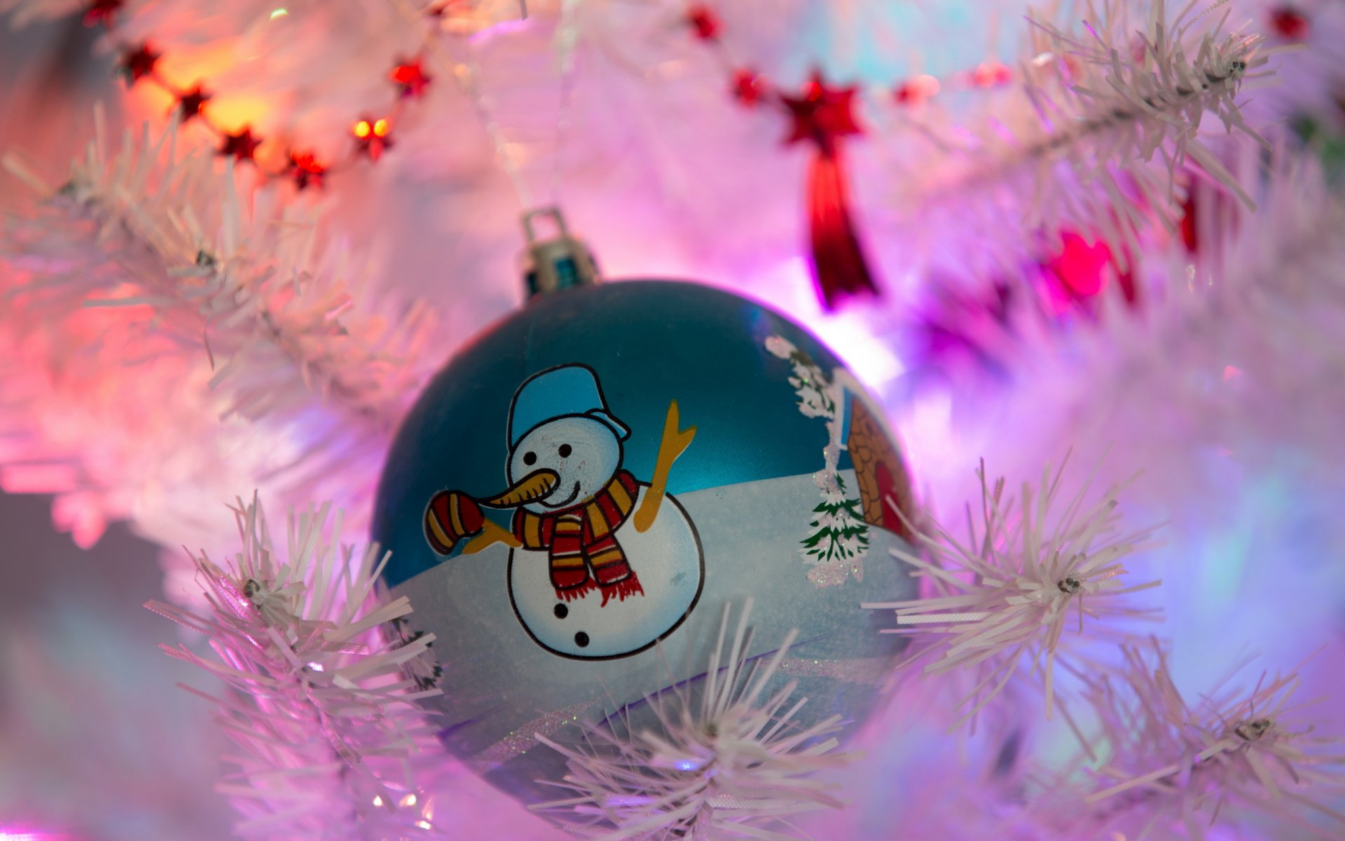 Palla giocattolo di natale con pupazzo di neve appeso sull'albero di natale biancoPalla giocattolo di Natale con pupazzo di neve appeso sull'albero di Natale bianco