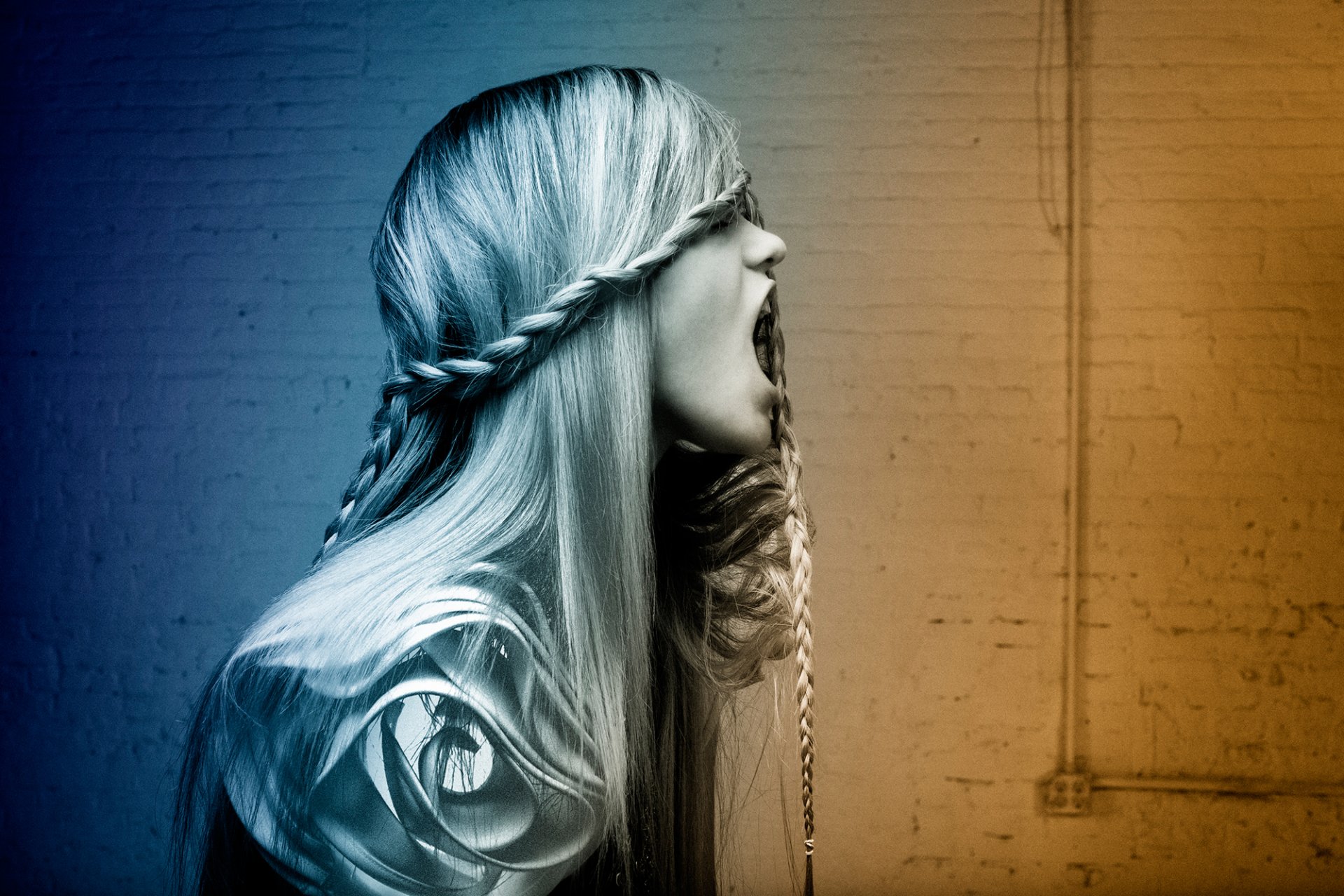 Ragazza con una falce sugli occhi che urla